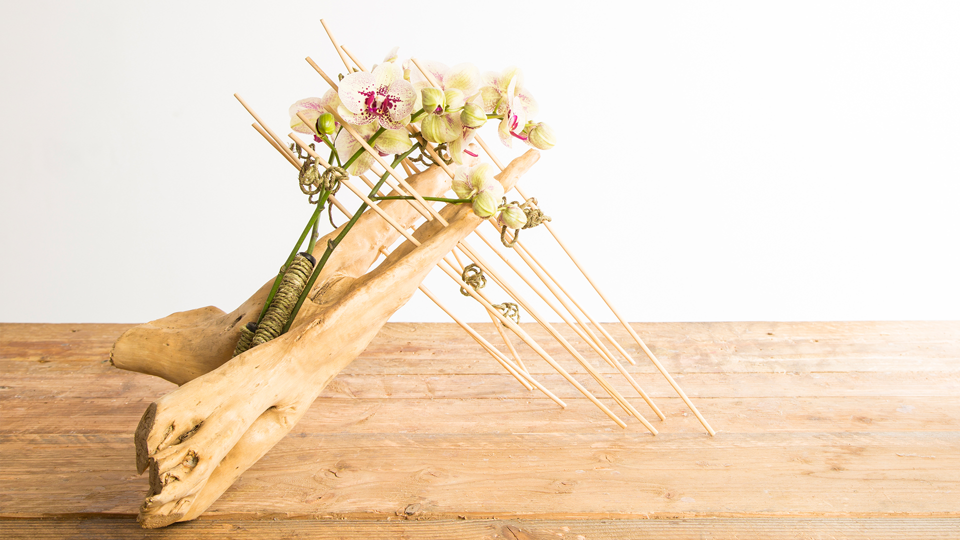 Natuurlijk arrangement met hout en Phalaenopsis gemaakt door Nelleke Bontje. Op deze manier kan een houtstronk een andere plaats vervullen in bloemwerk.