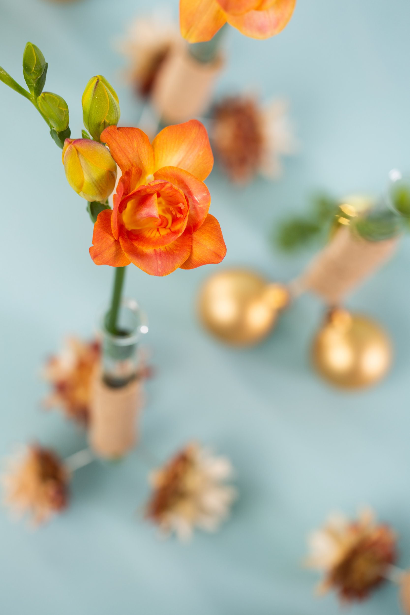 Idee voor vrolijke kerstdecoraties met Freesia. Prachtige oranje/rode Freesia's zijn in glazen buisjes geplaatst, die voorzien zijn van 'voetjes'  van gedroogde bloemen en kleine gouden kerstballen. Grappig voor op een feestelijk gedekte tafel! En een leuk extraatje is natuurlijk de zachte bloemengeur die de Freesia's verspreiden.