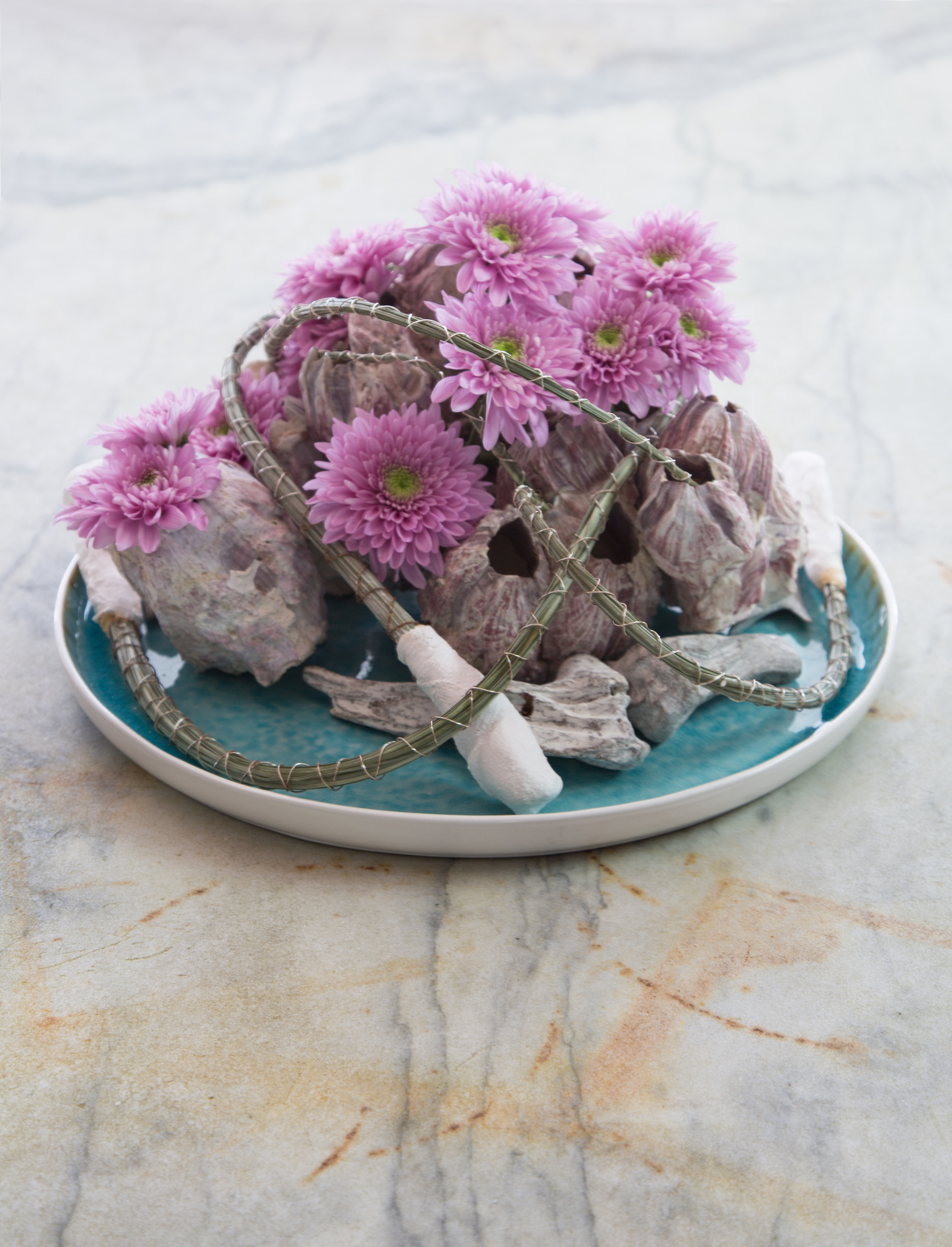 Dit winters bloemwerk is een afgeleide van het Zentoo winter moodboard. De chrysant 'Romance' is gebruikt met in gips gedompeld beregras en vast gezet in materialen uit de zee.
