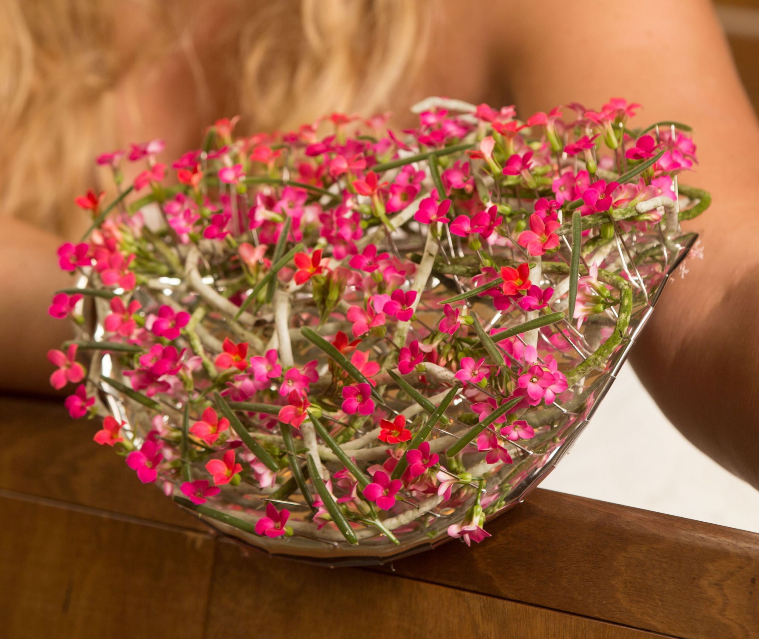 Floral designer Pim van den Akker maakte deze bijzondere florale armband met fuchsia en rode enkelbloemige Kalanchoë van Always Kalanchoë voor een bruiloft. Een origineel alternatief op een bruidsboeket. De Kalanchoë is een vrolijk vetplant die erg sterk is, en zo ook in dit ontwerp. De bloemetjes worden op de spelden van de ondergrond geprikt en blijven gedurende een dag mooi. De ondergrond is gemaakt van een stuk gebogen hout, vol gestoken met spelden en afgewerkt met spiegelfolie. Hoya en orchideeën wortels zijn als detail toegevoegd aan het florale ontwerp.