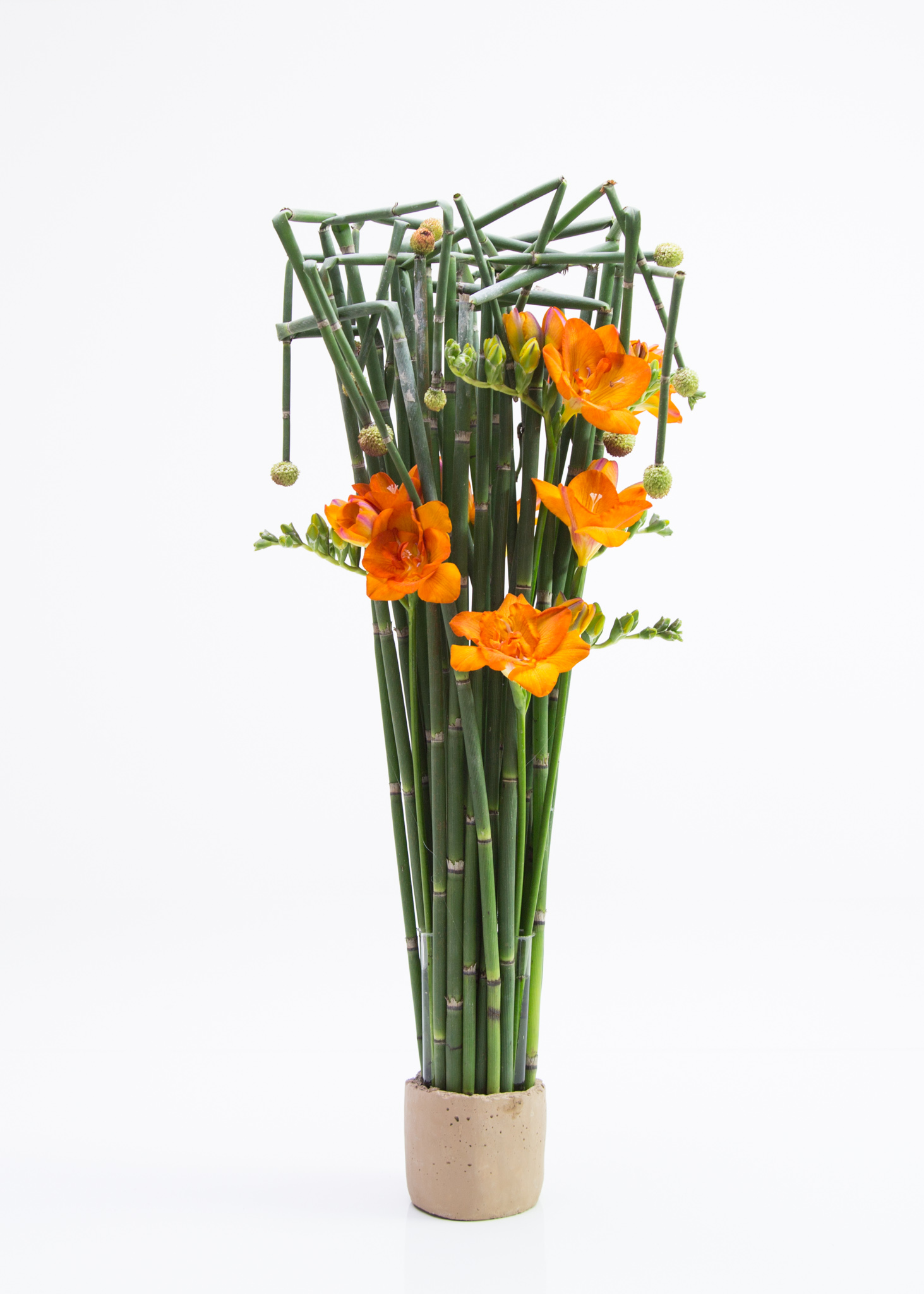 Een samengepakte bos Equisetum dient als frisgroene basis voor deze knaloranje Freesia's. Om het bloemwerk te voorzien van wat extra detail, knakte Kristel van Dijk een aantal stengels van de Equisetum voorzichtig en versierde ze met Allium knopjes.