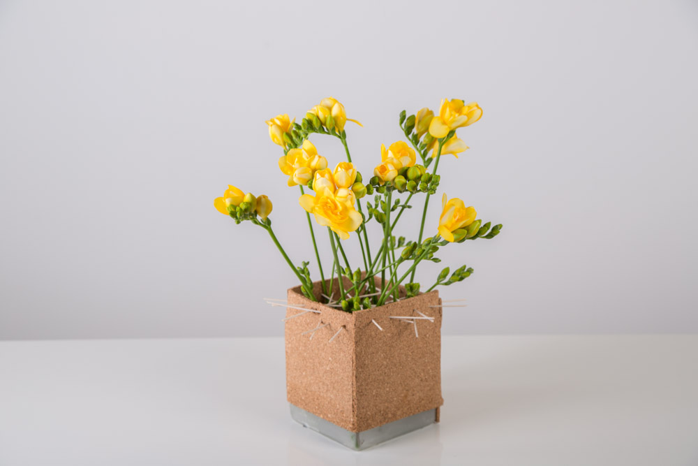 Kristel van Dijk maakte dit grappige #FreestyleFreesia kubus design met vrolijke gele Freesia. Simpel, maar zeer geschikt bloemwerk om cadeau te doen. Een vierkant vaasje wordt beplakt met kurk en gevuld met water. Dunne stokjes worden door het kurk geprikt als leuk detail, maar ook als raster voor het Freesia bloemwerkje. Tussen deze stokjes worden de Freesia geschikt.