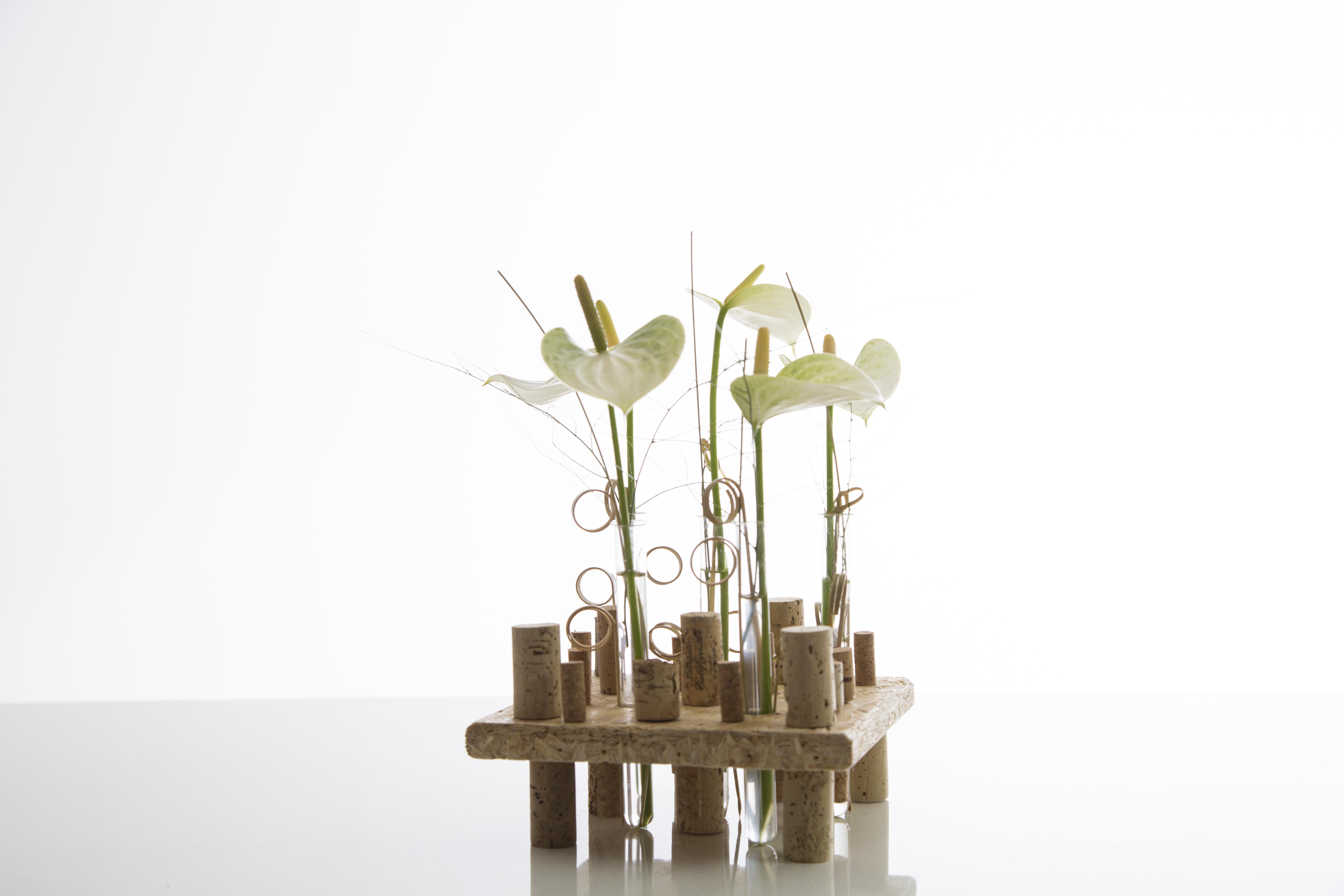 Eenvoudig maar met een cool effect door het gebruik van OSB. De glazen buisjes bieden plek aan wat vers afgesneden Anthurium Adios® White.