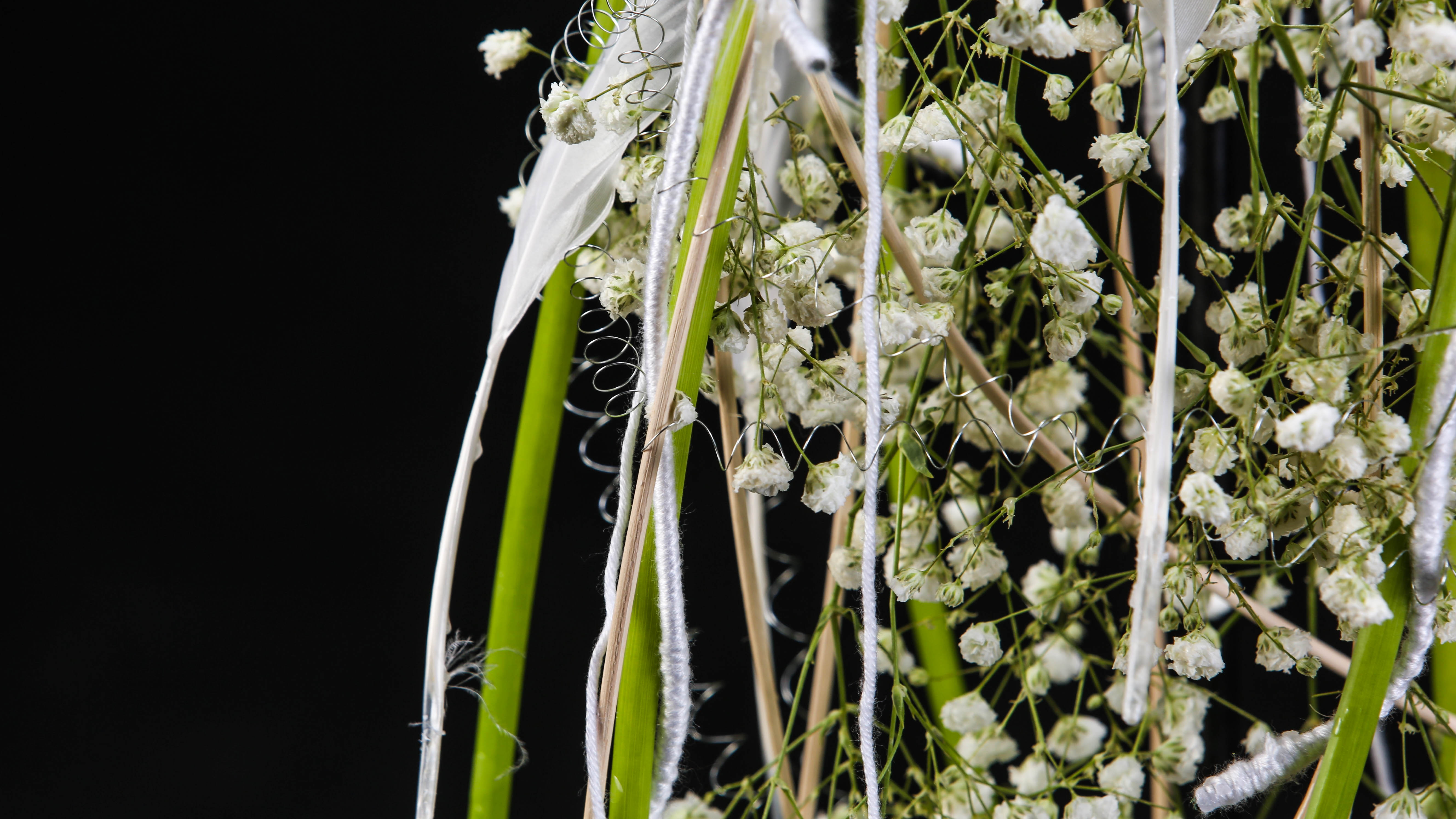 Een idee voor een anders dan anders bruidsboeket. Pim van den Akker gaf recent masterclasses in China bij Sikastone. Hij liet studenten zien hoe je met goeie technieken oneindig veel interessant bruidswerk kunt maken. In dit witte design gebruikte hij Gypsophila en Calla's in een structuur van draad en wol. Hij voegde er wat veren aan toe voor een romantische touch.