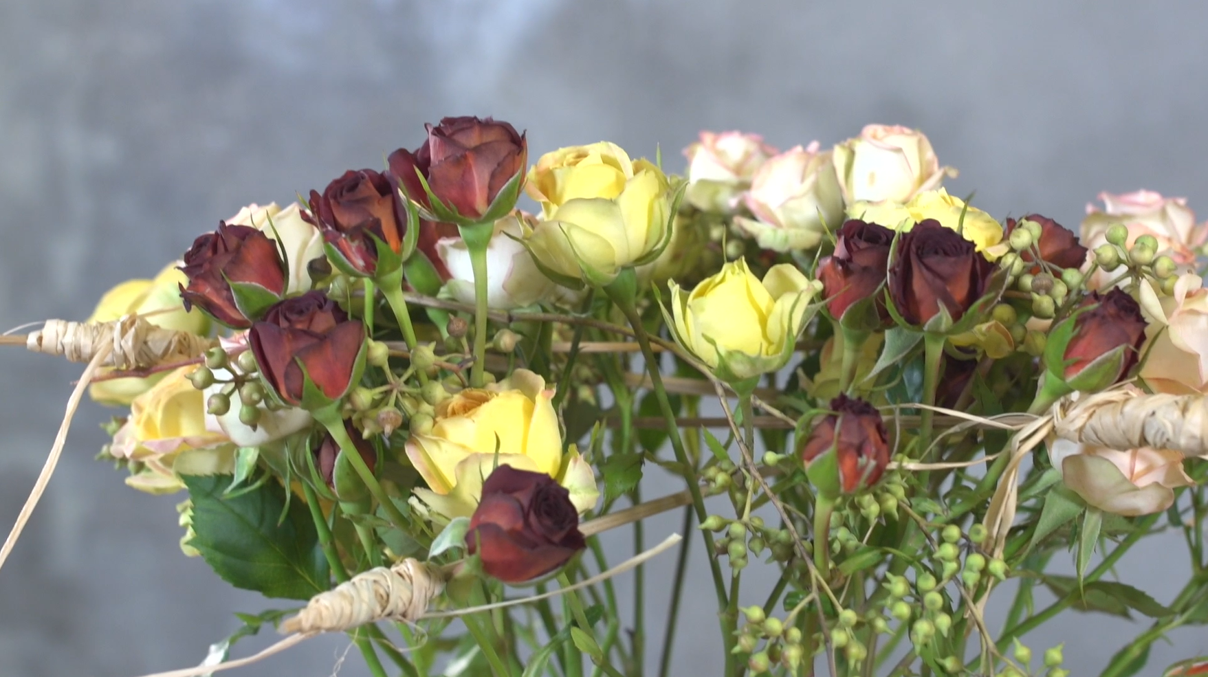 Pim van den Akker deelt een idee voor een herfst arrangement met de prachtige trosrozen van Interplant Roses. In dit arrangement worden er drie verschillende variëteiten gebruikt in herfst tinten: 'Chococcino®', 'Sweet Kelly®' en 'Azore®'. Met zoveel prachtige rozen op één steel, wil je deze eigenschap ook zo accentueren! Het arrangement staat hoog op de enkele stelen waaruit vele vertakkingen met rozen bovenuit steken. Charmeer je klanten met de schoonheid van deze bloemen en geef ze een paar tips mee: snij de stelen 1 cm korter met een scherp en schoon mes, gebruik een schone vaas en geef bloemenvoedsel mee in het water zodat alle rozen mooi open gaan.