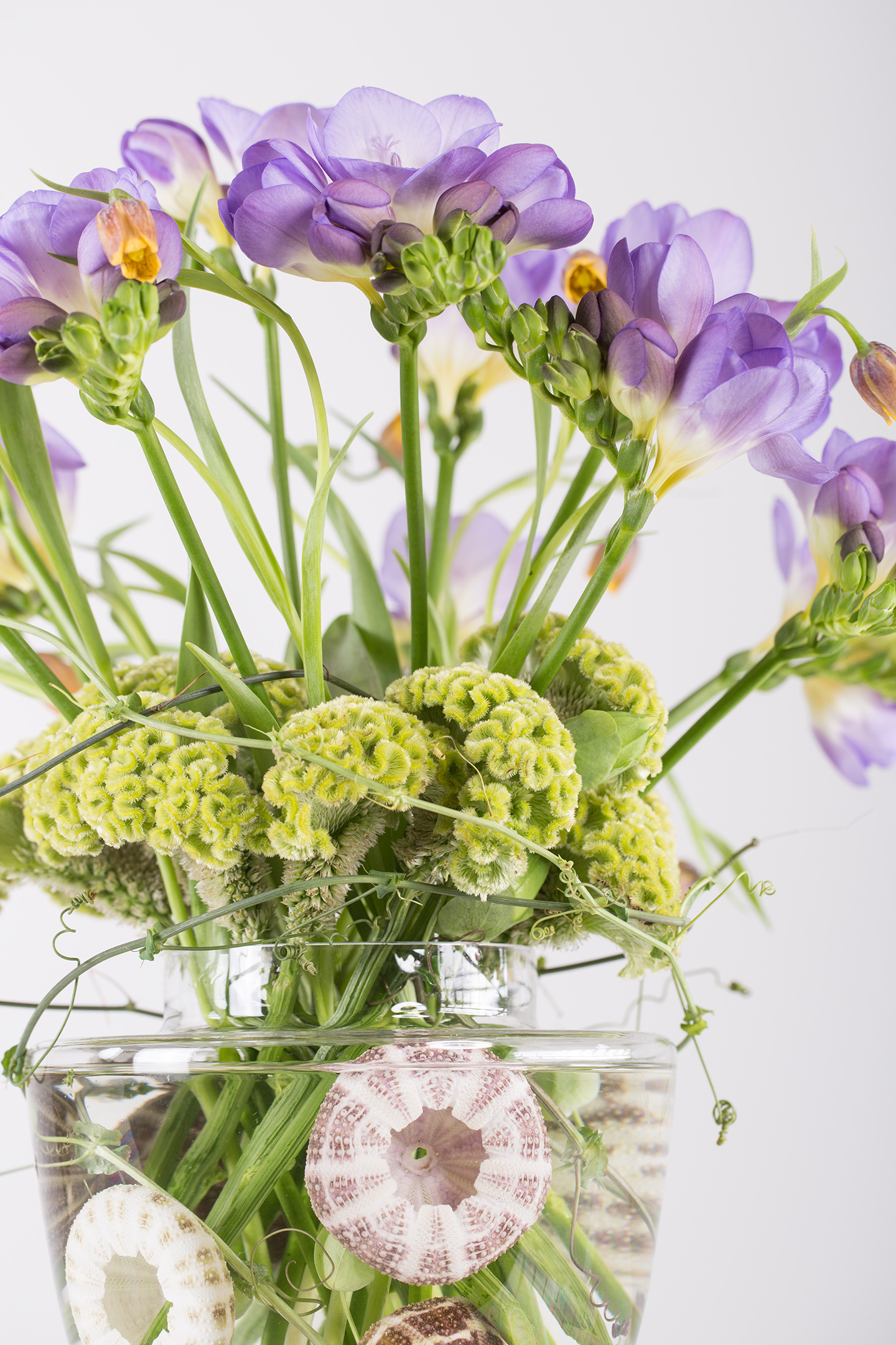 Roos van Unen maakte met lila Freesia een heel apart #FreestyleFreesia design. De vorm van het design met de Freesia bovenin, de Celosia en de zee egels onderaan lijkt wel op een wezen dat in de diepte van de oceaan leeft. Een prachtig plaatje gevat in een verrassend bloemstuk.
