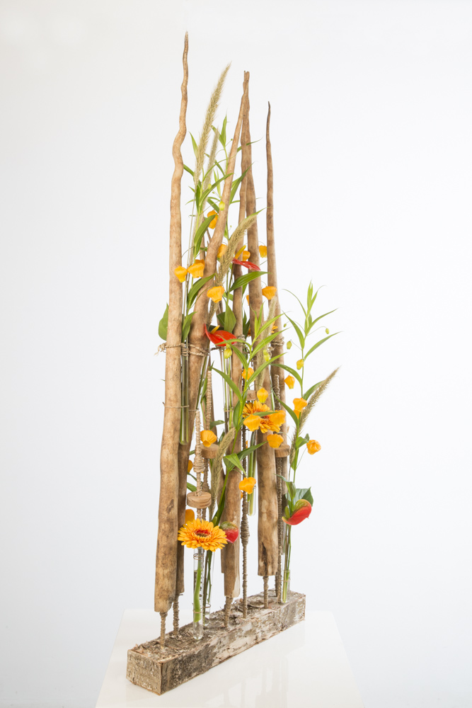De Britse bloemsierkunstenaar David Ragg maakt een prachtig hoog stuk met hout, Anthuriums, Gerbera's en Sandersonia.