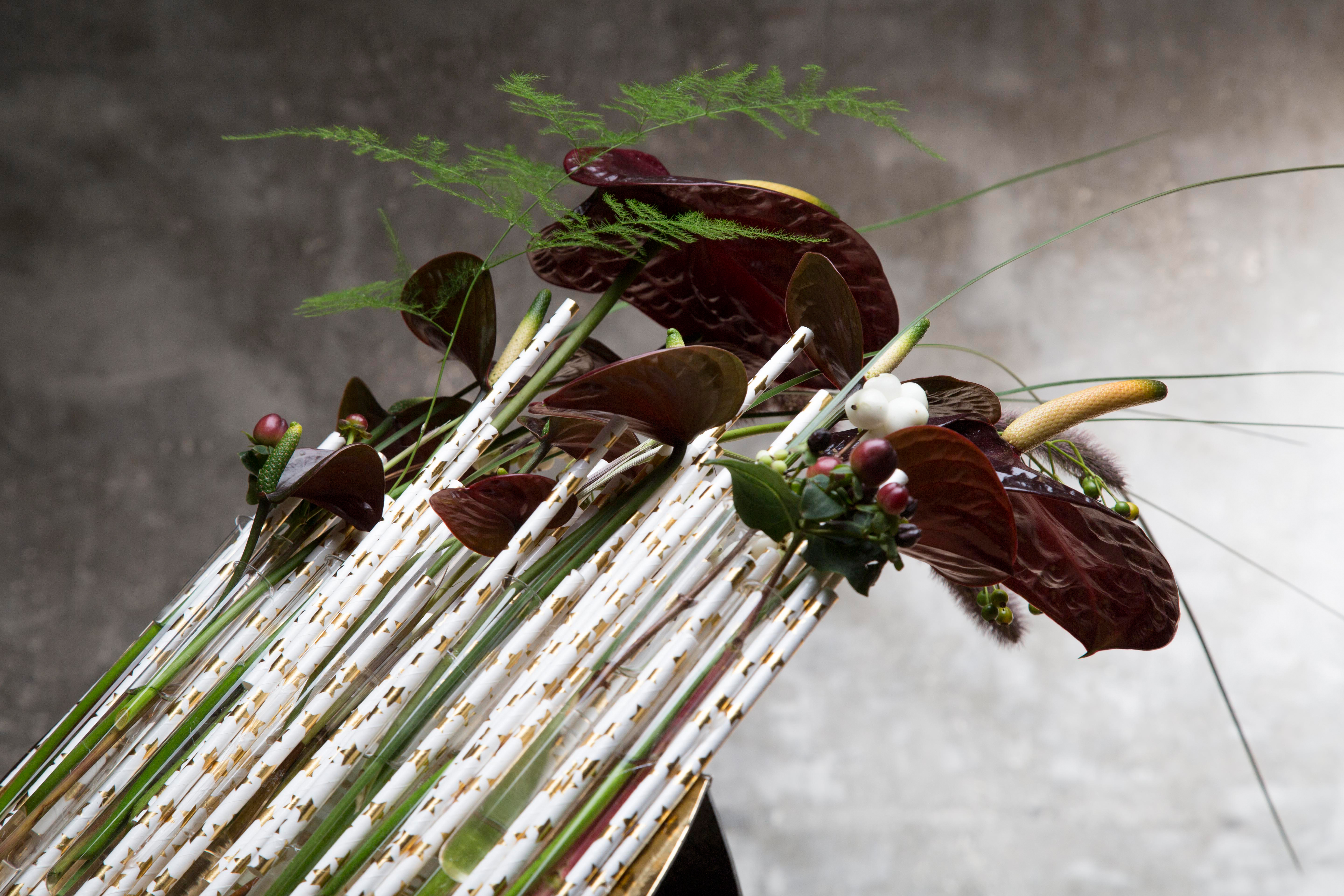 Een kerstbloemwerk van Bea Beroy met papieren rietjes, glazen buisjes en prachtige Anthuriums.