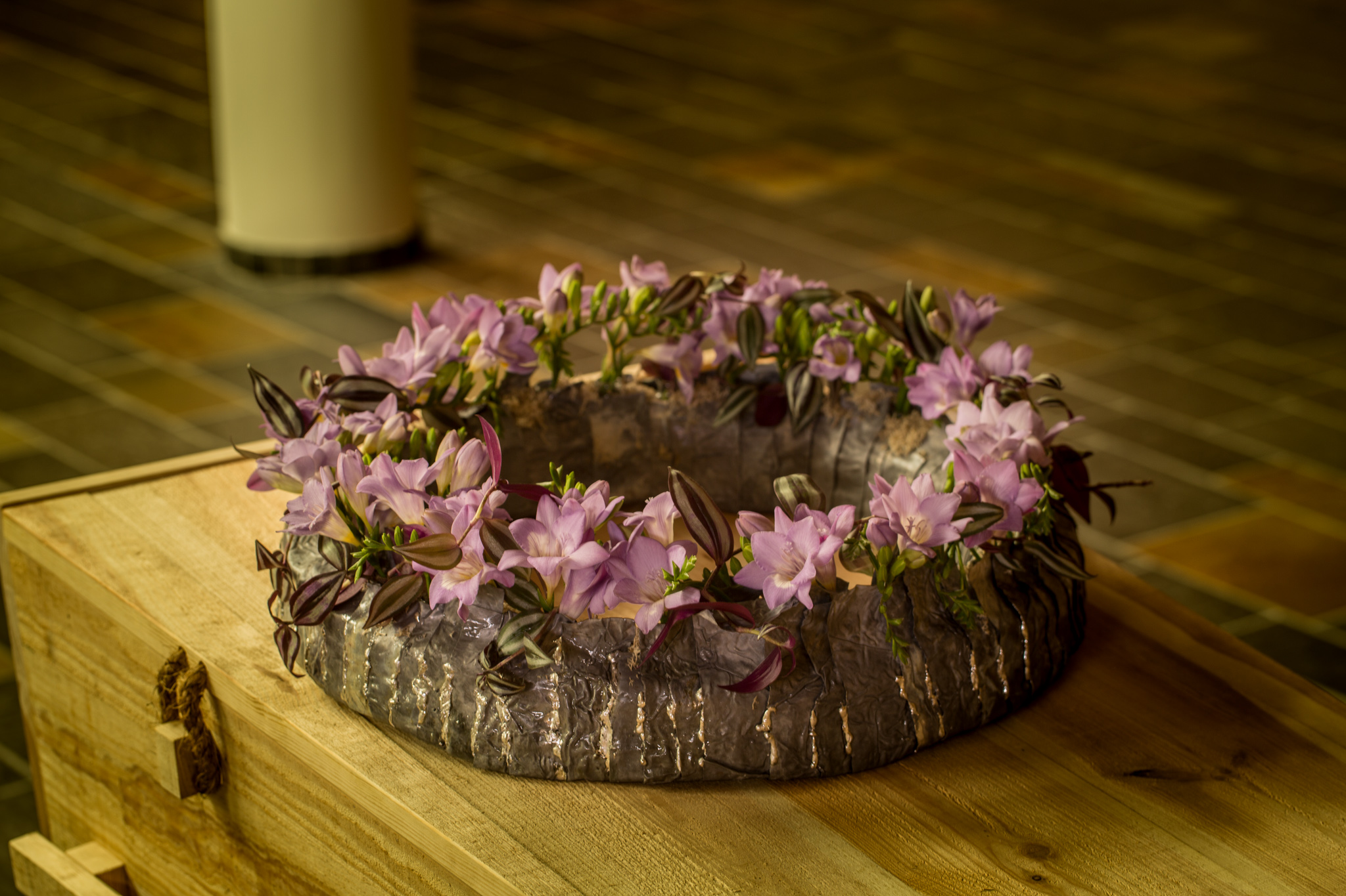 Voorbeeld van afscheidsbloemwerk met Freesia. De Freesia heeft voor veel mensen een emotionele betekenis. Geen wonder dat de bloem veel gebruikt wordt in afscheidsbloemwerk. Roos van Unen maakte deze mooie krans met paarse Freesia en de bladeren van de Tradescantia. De steekschuim ring van OASIS is bedekt met repen snijlood.