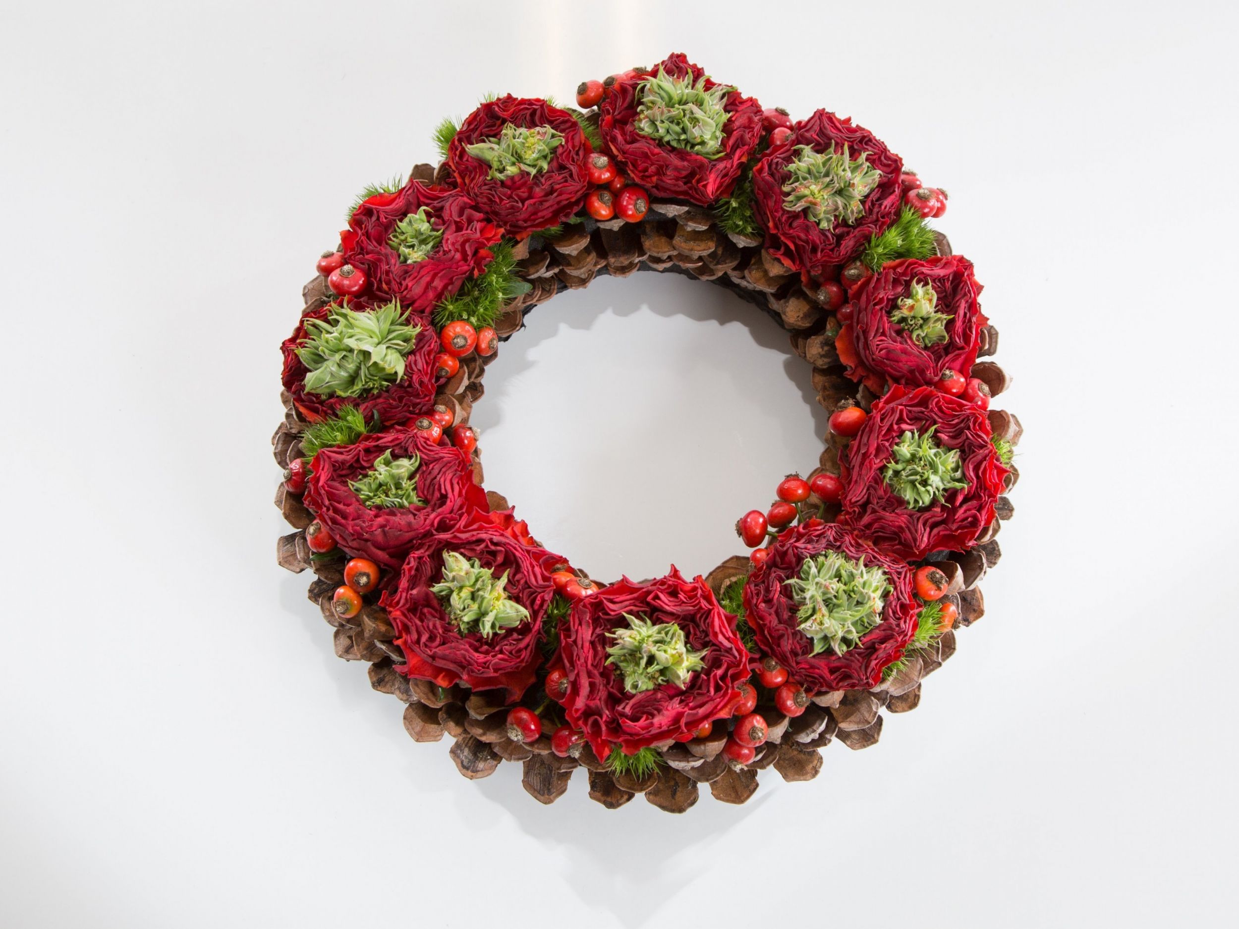 Voorbeeld van een krans op basis van zwart steekschuim. Roos van Unen experimenteerde met de Black BIOLIT krans van OASIS en maakte hier een mooi kerstdesign mee met slechts enkele materialen; een paar prachtige rozen, stukjes dennenappel, wat mos en bessen. Mooi contrast met het zwarte steekschuim en dus extra leuk om dat dan ook nog deels te laten zien!