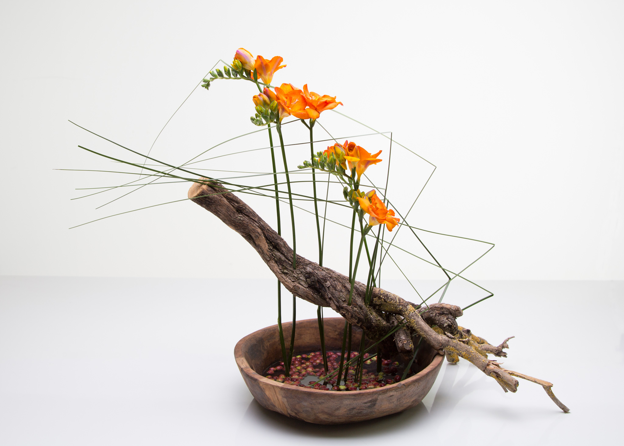 Dit bloemwerk, gemaakt door Pim van den Akker, is minimalistisch in materialen en heeft een hele natuurlijke look. Pim heeft eerst een aantal gaten geboord in de grote tak. De gaten zijn net groot genoeg voor de stelen van de freesia. Daarna bevestigd hij de tak aan de houten schaal met een paar schroeven. De houten schaal is waterdicht genaakt met een laklaag. De freesia's worden in de schaal geplaatst samen met wat staalgras dat voor een extra effect is geknakt. Als finishing touch gooit Pim een hand hypericum besjes in het water.