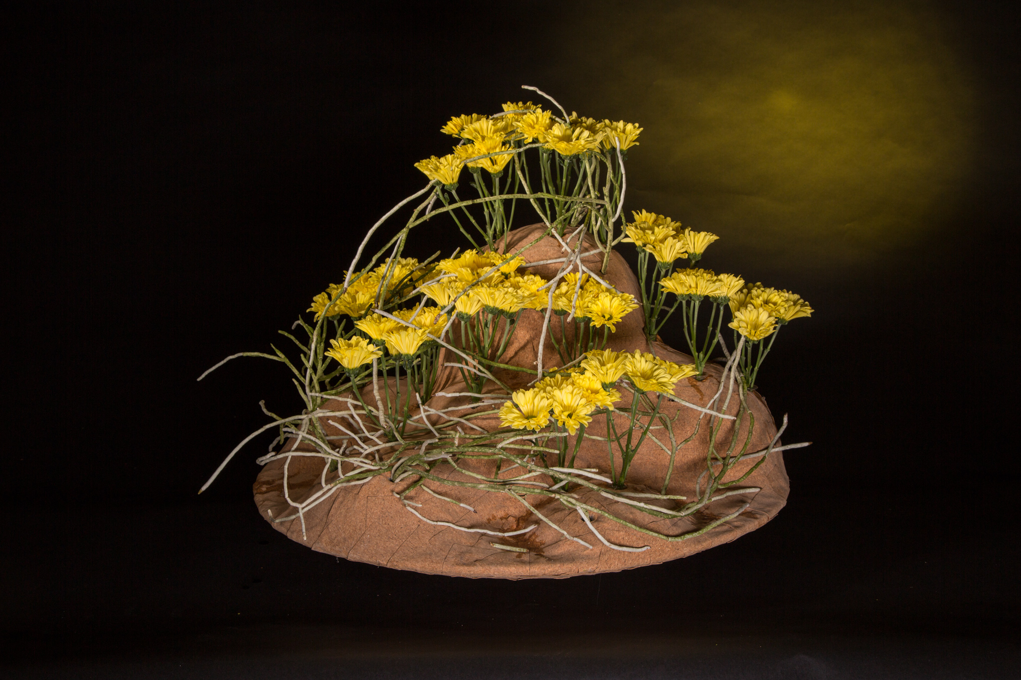 Chrysant 'Nibali' is een sterke nieuwe variëteit met een bijzondere eigenschap: zodra de bloem wordt geoogst, sluit de bloem haar blaadjes en opent ze pas weer zodra de bloemen in water staan. Zo onthult ze langzaam aan haar bijzondere frisgroene hart. Pim van den Akker plaatste de 'Nibali' in een object met organische vormen waarin de bloemen worden gekoesterd.