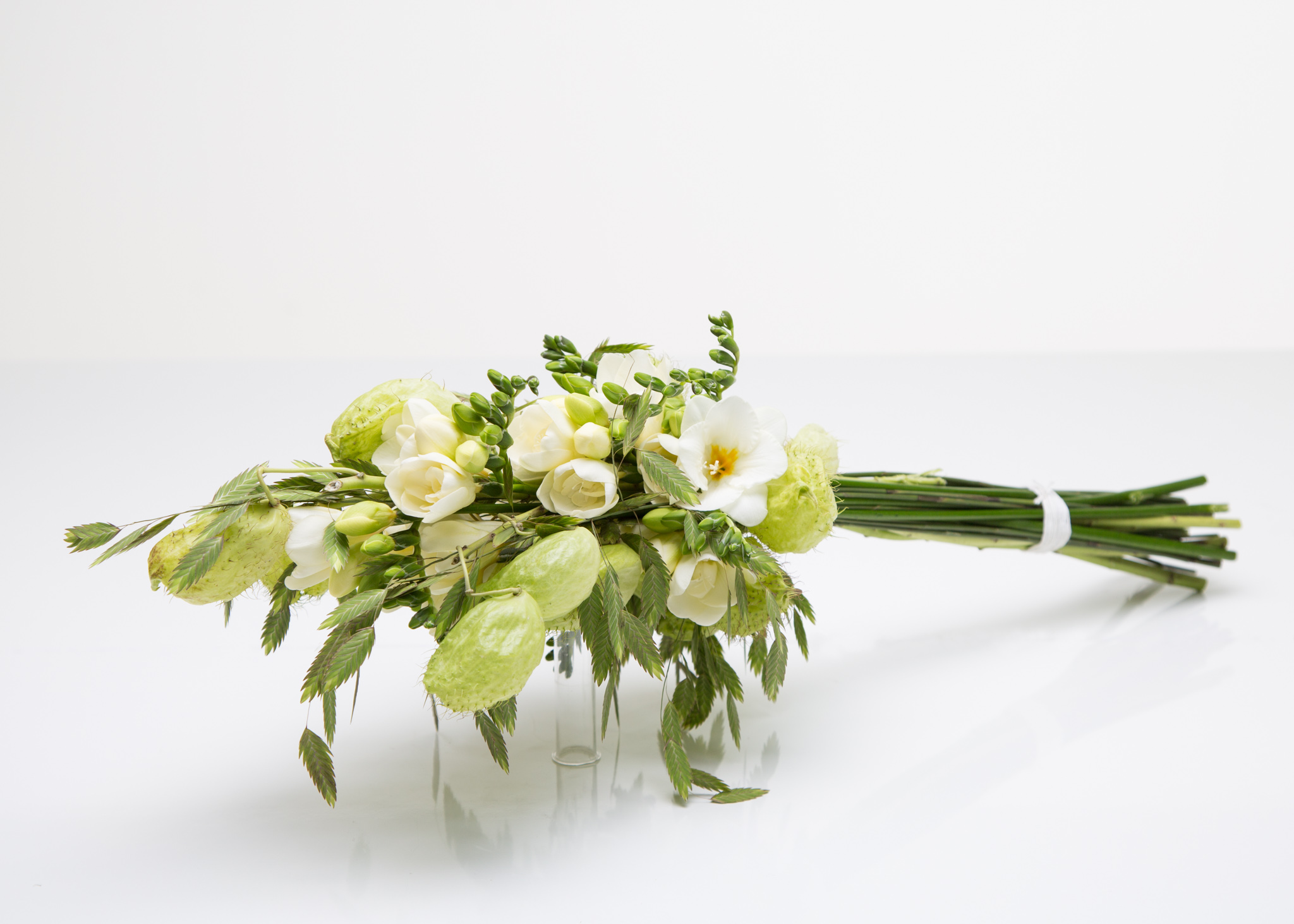 Dit is een parallel en met de hand gebonden boeket waarbij de stelen allemaal naast elkaar geplaatst zijn. Met deze bindtechniek krijg je een compact boeket en samen met de rechte stelen een luxe uitstraling. Nelleke Bontje heeft voor dit boeket de witte Freesia's gecombineerd met Asclepia 'Moby Dick' ballen en Chasmanthium grassen.