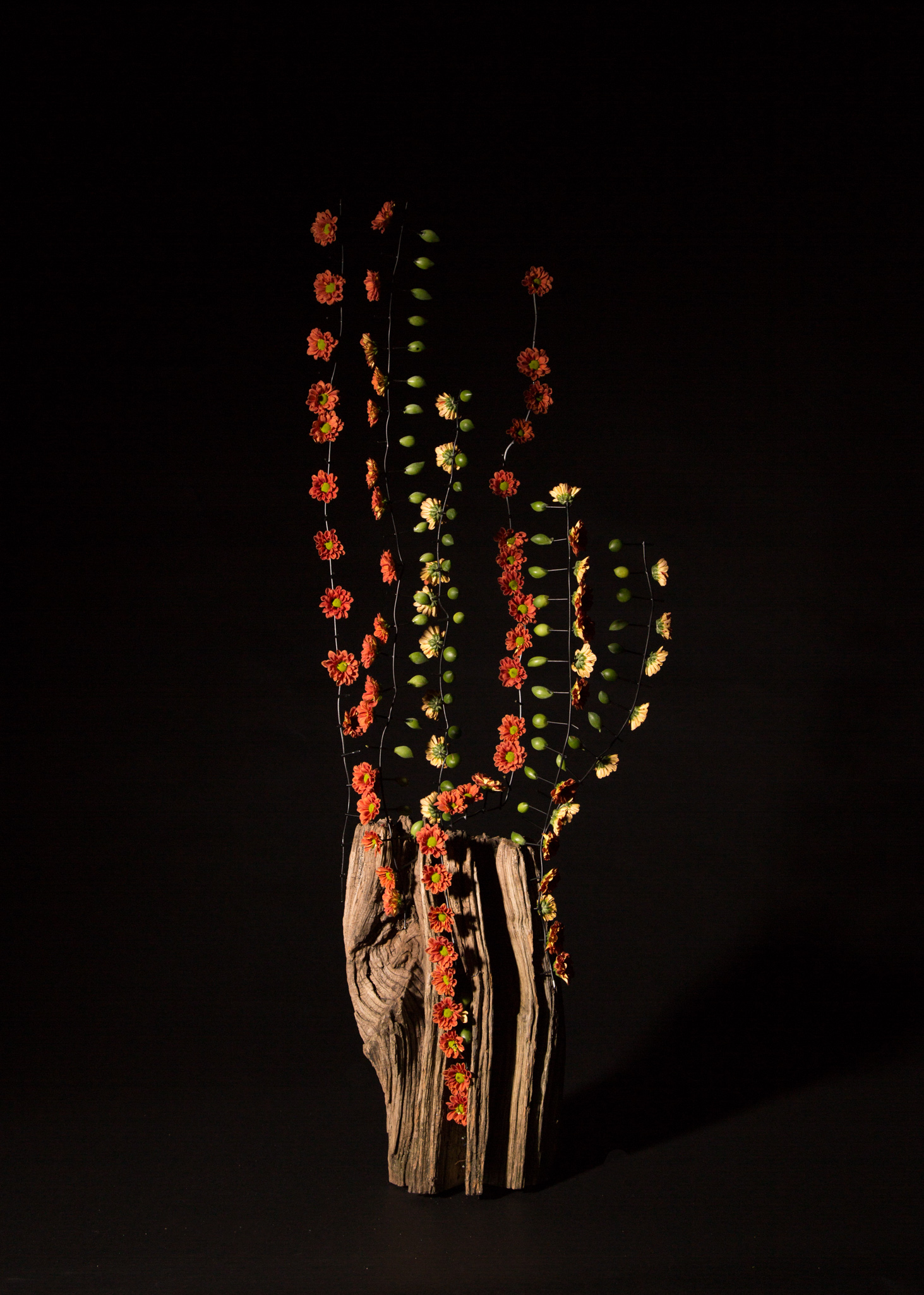 Een juweel uit de schatkist van Zentoo: de santini Chrysant 'Pimento Orange'. Deze warme kleur Chrysant is prachtig voor najaarsbloemwerk want ze combineert prachtig met bessen, schors en andere typische herfstmaterialen. Roos van Unen maakte dit bloemwerk met herfstbos-gevoel. Je zou zelfs de bloemen kunnen beschouwen als herfstbladeren die van de boom vallen...