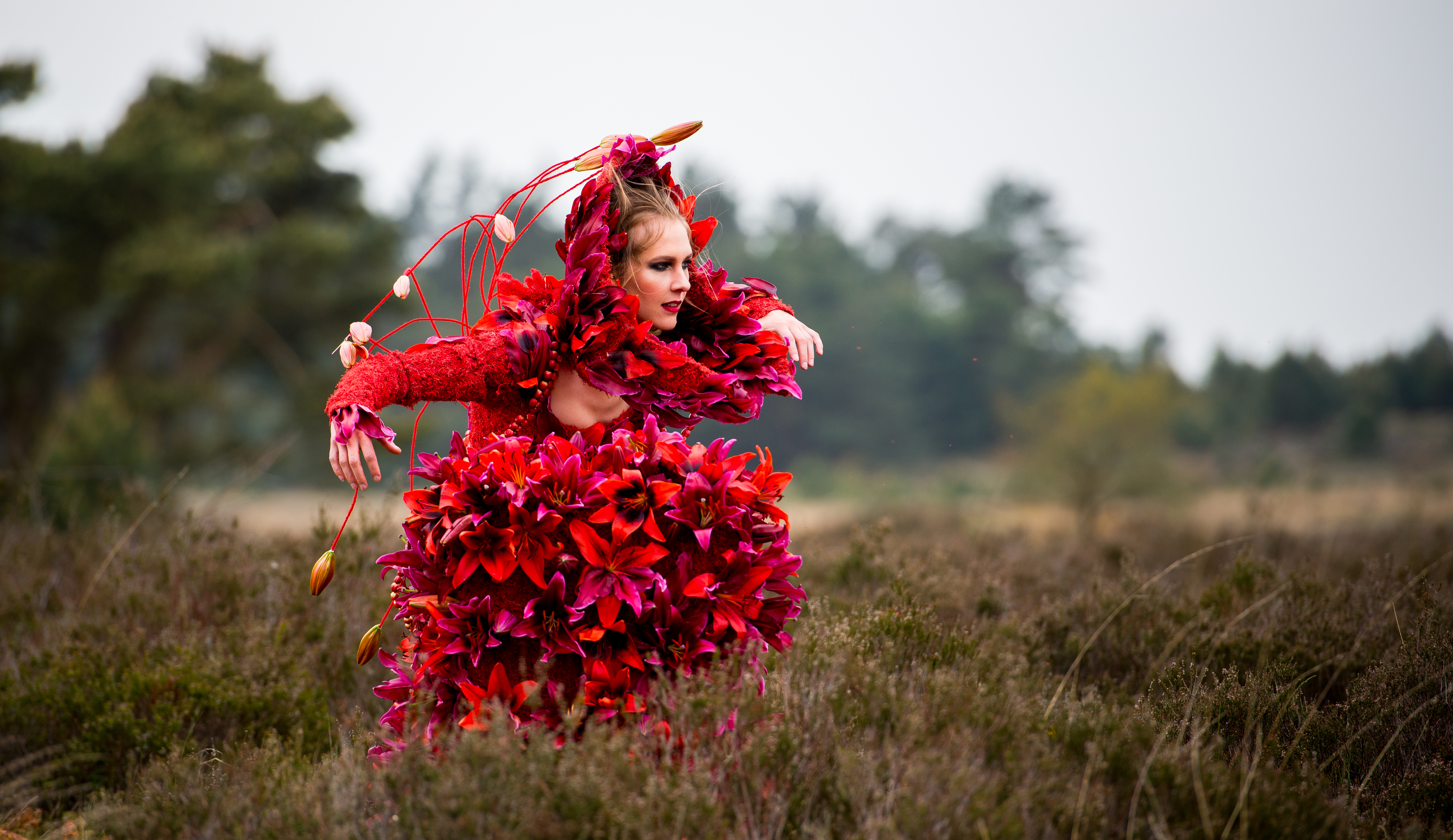 Foto van de shoot voor YourLily, waar Pim van den Akker een prachtige rode jurk met lelies voor creëerde.