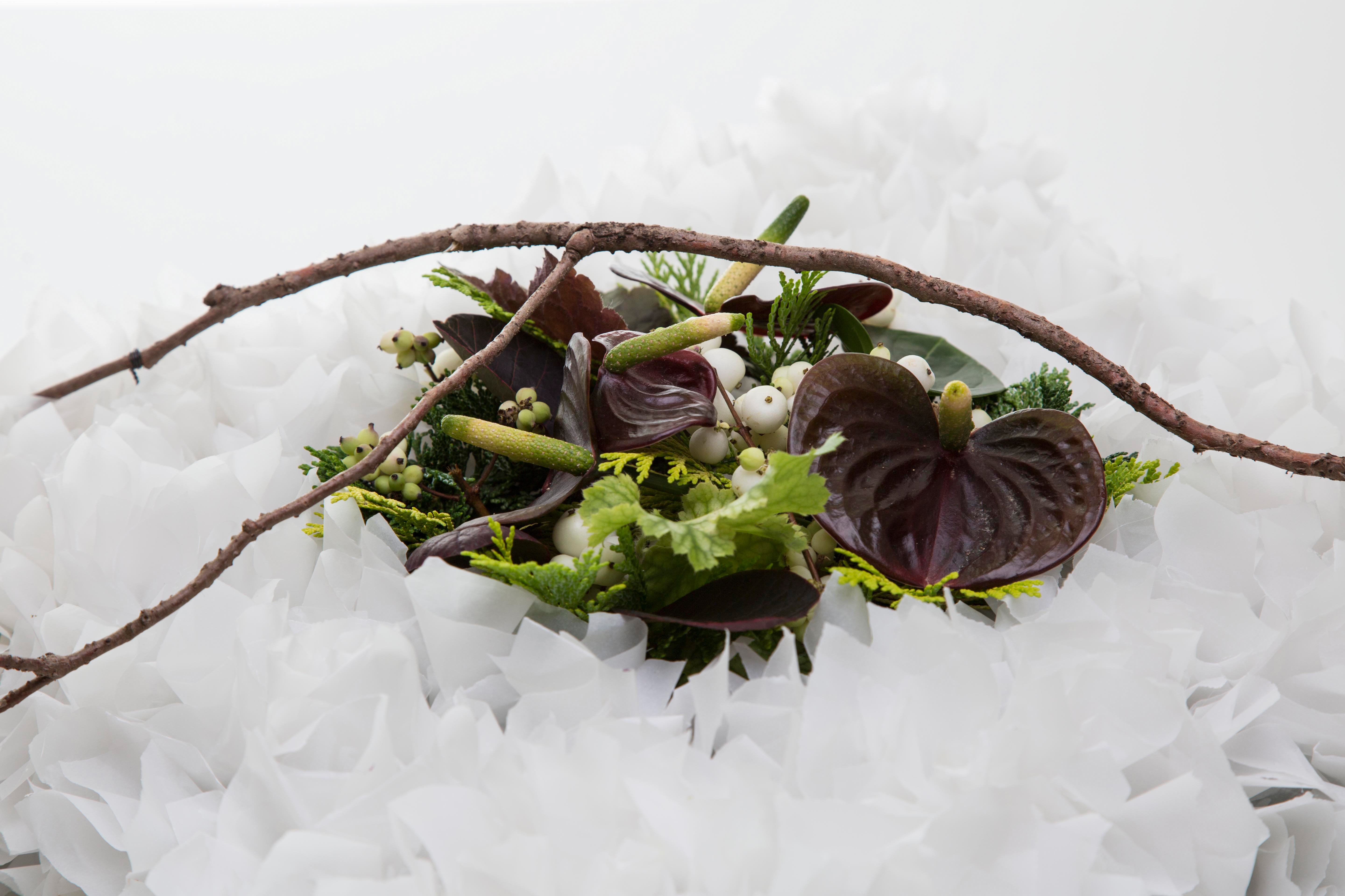 Spaanse designer Bea Beroy creëerde met talloze laagjes wit papier een prachtige, haast dromerige ondergrond voor Adios Chocolat Anthuriums, Symphoricarpos bessen en divers groen materiaal. Een stijlvol afscheidsbloemwerk.