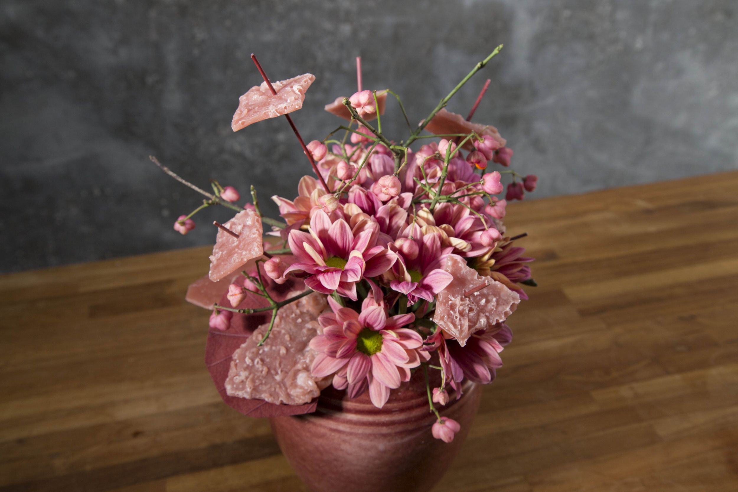 Roze herfstbloemwerk met 'Grand Salmon' chrysanten