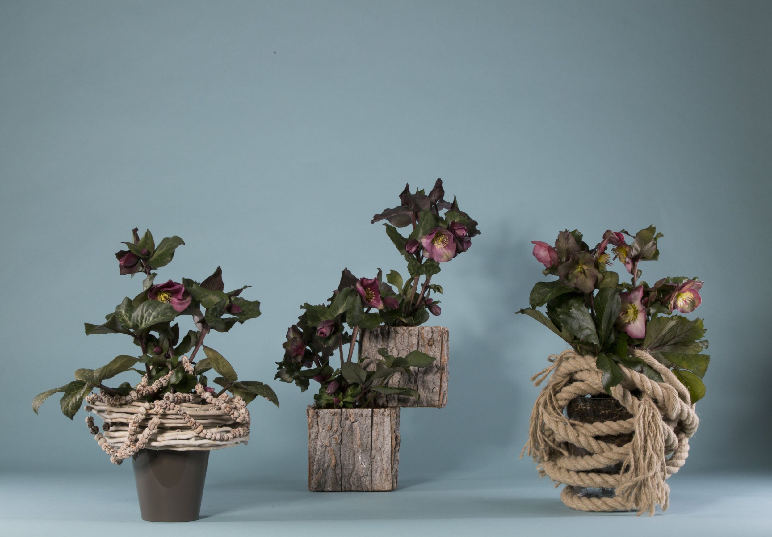 Drie snelle, winterse arrangement ideeën met de Helleborus 'Frostkiss' van Kwekerij Verboom gemaakt tijdens de 'Live Q&A' op Facebook op maandag 19 november 2018. Pim van den Akker liet tijdens de Live Q&A zien dat de Helleborus 'Frostkiss' mooi gecombineerd kan worden met materialen die mooi verweren of mooi blijven wanneer het plantenarrangement buiten wordt geplaatst, zoals touw en bast. Zo krijgt het arrangement een robuust karakter wat past bij de sterke Helleborus plant die graag naar buiten gaat.