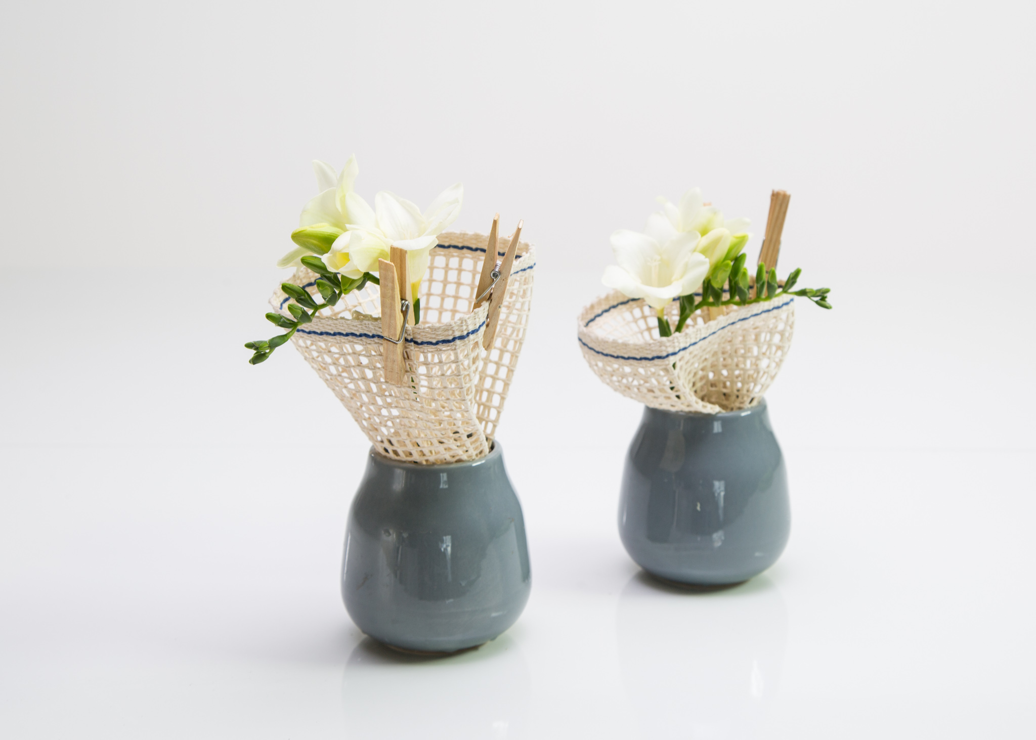 Twee van hetzelfde, schattige vaasjes met freesia's. Klein bloemwerk is ook super!