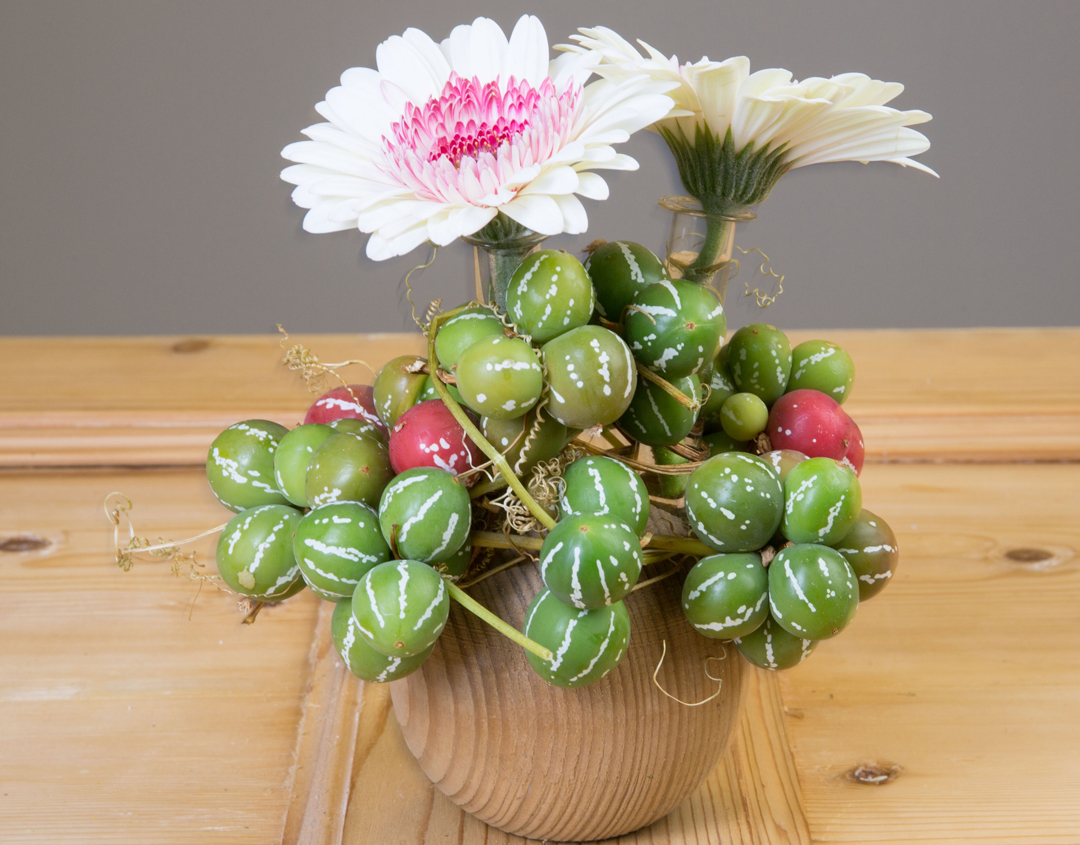 Een houten sierknop voor trappen kun je eenvoudig omtoveren tot vaasje door er gaten in te boren en glazen buisjes in te steken. In dit geval gebruikte Pim twee gerbera's en wat Diplocyclos.
