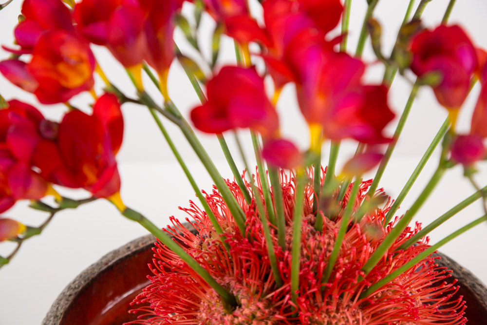 Dit vurige #FreestyleFreesia met de prachtig rode Freesia en Leucospermum zijn een krachtige combinatie gemaakt door Roos van Unen. De verschillende rode elementen zijn in cirkels toegevoegd aan het design om zo de kracht en de kleur te accentueren. Een vleugje geel in de rode Freesia zorgt ervoor dat het net lijkt alsof het design vlamt!