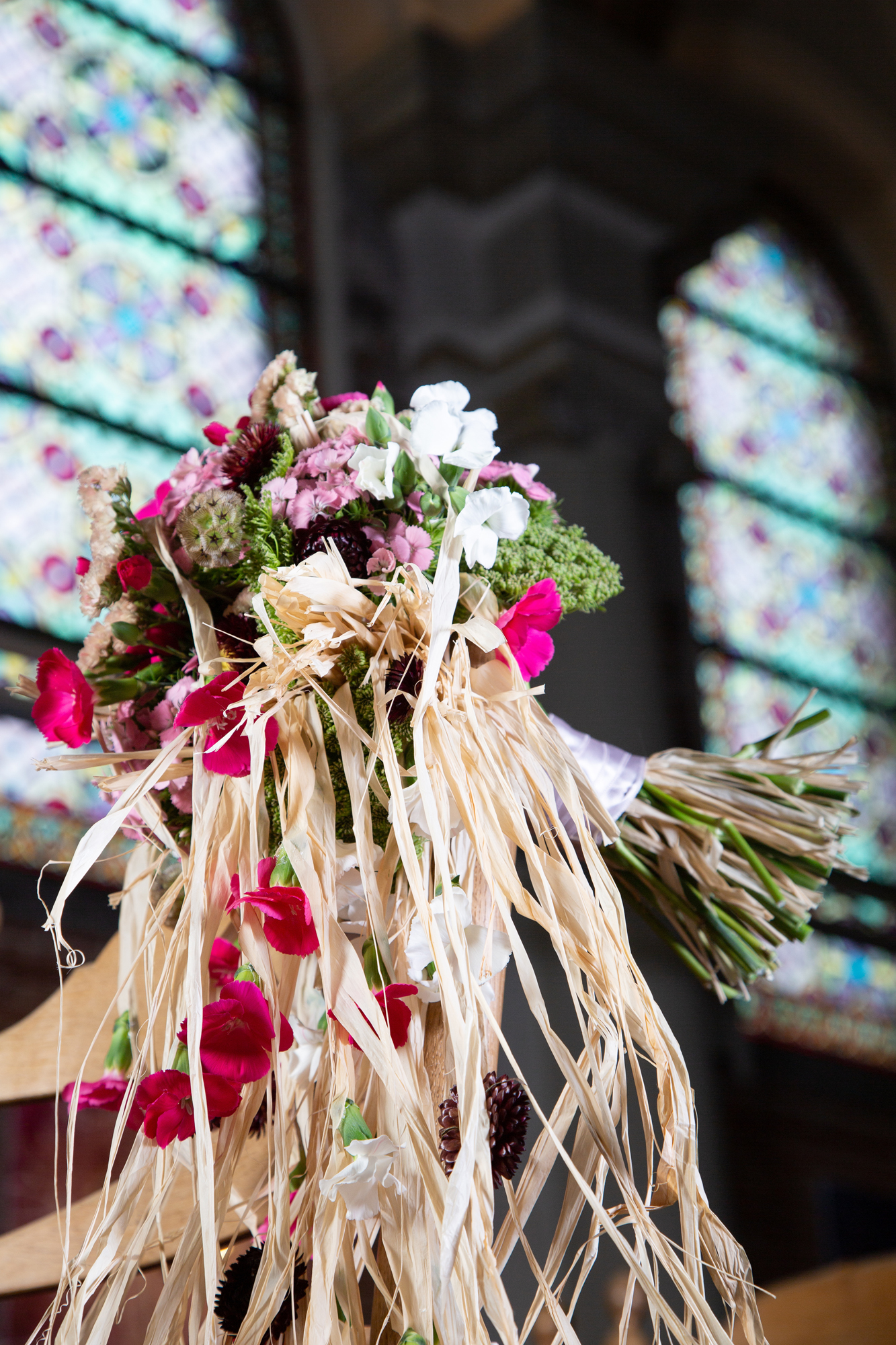 Watervalbruidsboeket met basis van raffia