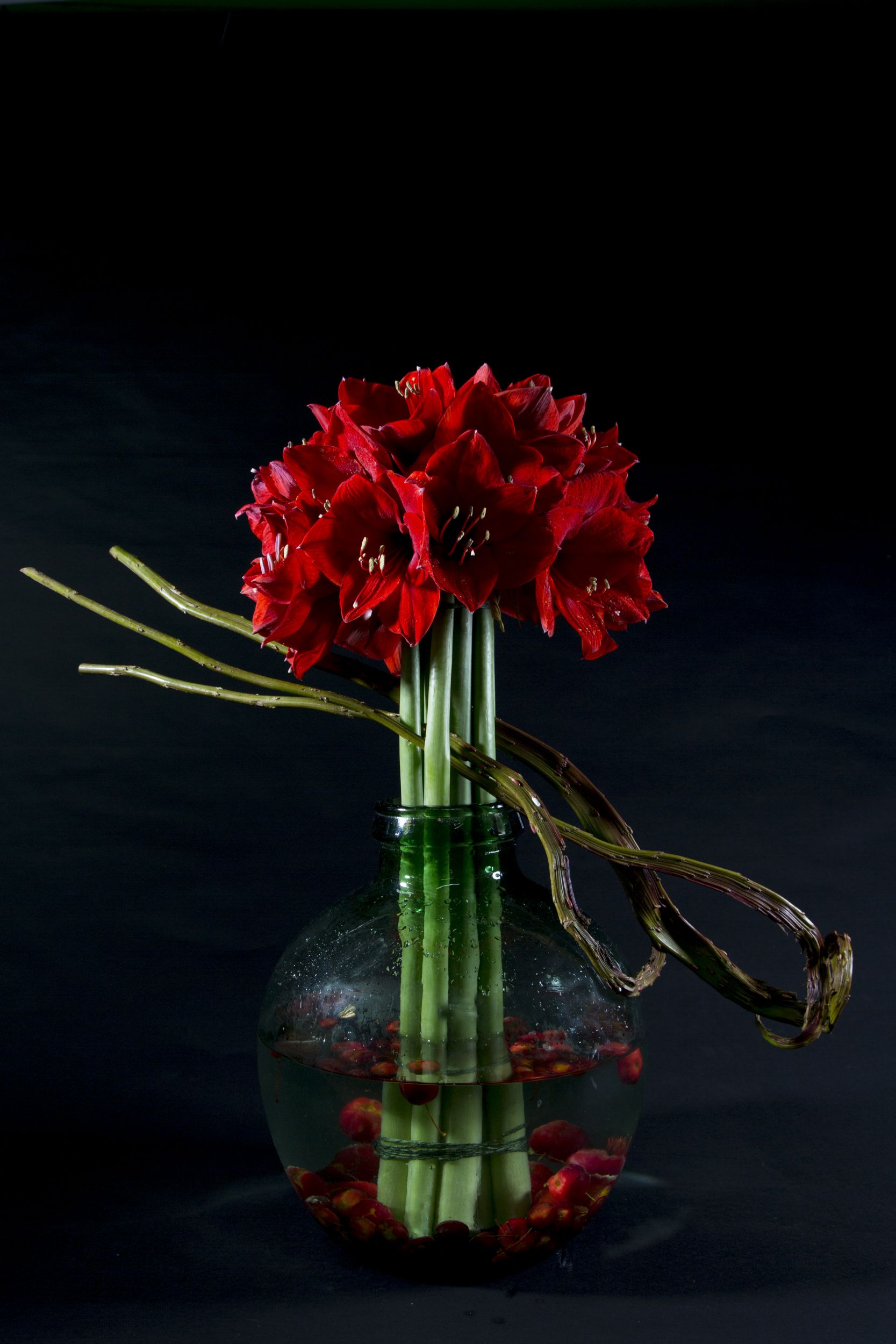 De Amaryllis is een echte winterfavoriet en zeker met deze warme, diep rode kleur. De kleur creëert een warm wintergevoel en Roos van Unen gebruikt deze prachtbloem om een winters design te maken. Door een aantal band-wilgen takken tussen de stelen door te weven geeft ze dit boeket extra beweging. Als extra detail en om het rood terug te laten komen in het design, zijn er malus appeltjes toegevoegd.