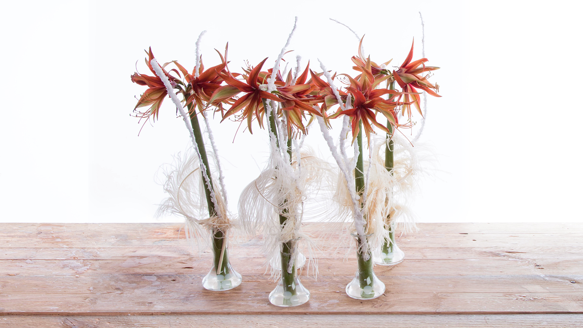 Winters arrangement met Amaryllis 'Merengue', veren en besneeuwde takjes. Leuk als groepje neer te zetten!