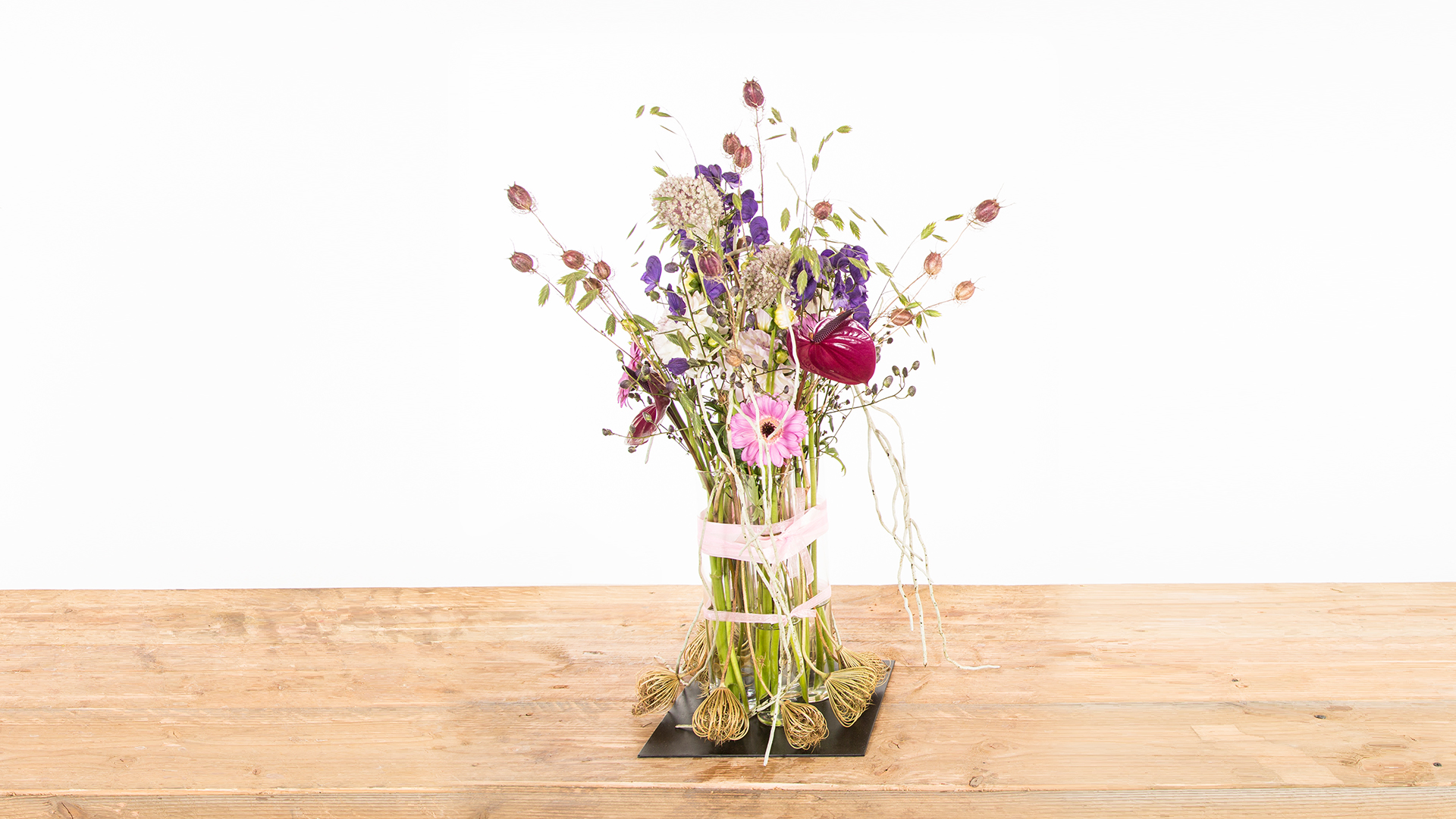 Nelleke maakt een ondergrond van een standaard en 4 smalle vazen. Hierin worden prachtige zomerbloemen geschikt.