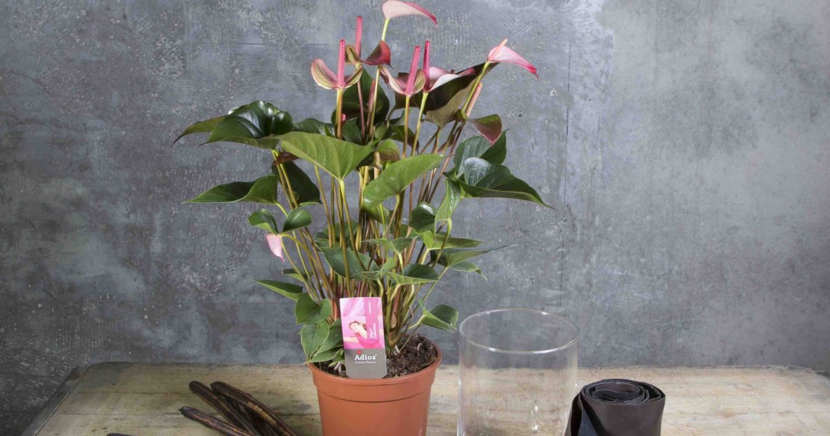 Take the beautiful pink Anthurium 'Adios® Hot Lips' from Fuerte Planta out of its pot and place it in the cylinder vase.