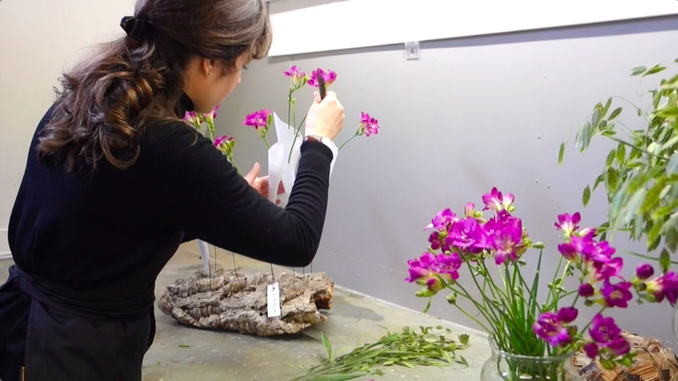 Dutch florist Roos van Unen shows her take on Freesias, presenting the flower in a fun way: with some simple paper, melted candle wax and plastic tubes she creates little cone-shaped vases. Once put on wire she sticks it into a piece of soft cork wood. #FreestyleFreesia: sharing ideas and inspiration!