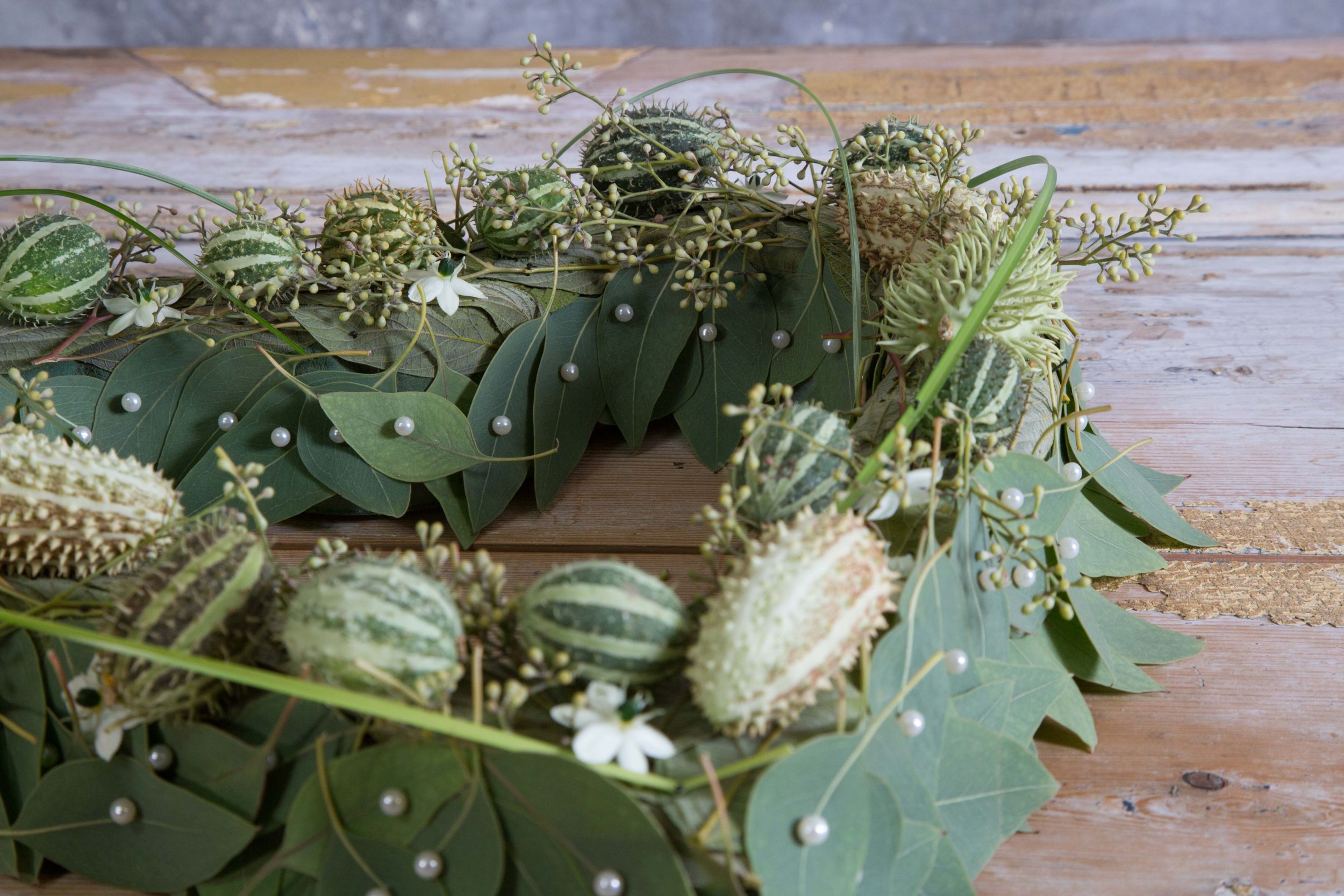 Roos van Unen has created a green funeral arrangement with an open heart base of Oasis floral foam. Around the heart, Eucalyptus leaves are pinned and on top of it a selection of decorative fruits play the leading role. It is not always necessary to use flowers to create a delicate impact.