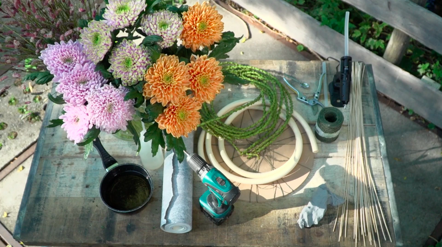 A flower arrangement tutorial by Kristel van Dijk in which she creates a stage for the beautiful 'Rossano' Chrysanthemums from Deliflor Chrysanten. She chose to use three colours of this family; 'Rossano', 'Rossano Charlotte' and 'Rossano Orange' and combines these warm colours with a base in cold tones. This design is great for autumn but can easily be adjusted to any other season if you change the materials (think of moss in stead of wallpaper) and colours of the Chrysanthemums. Lovely in every way!