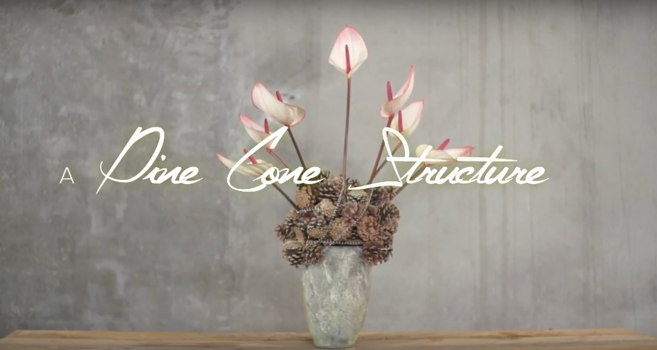 Pim van den Akker loves to show you floral designs with little ingredients and a big wow-factor. In this creation the pine cone base has a modest look yet cool structure which makes the beautiful 'Facetto' Anthuriums stand out even more!