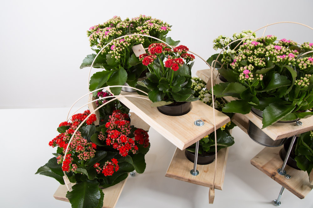 Pim van den Akker created a technical indoor arrangement with the Kalanchoë from Always Kalanchoë. This technical design is a beautiful centre piece in which you can show your craftmanship. The bolts and wood combined with the colourful Kalanchoë create a cool effect. This flowering succulent is very easy to take care of and its flowers will remain beautiful for a long time, which makes the Kalanchoë an interesting plant for arrangements.