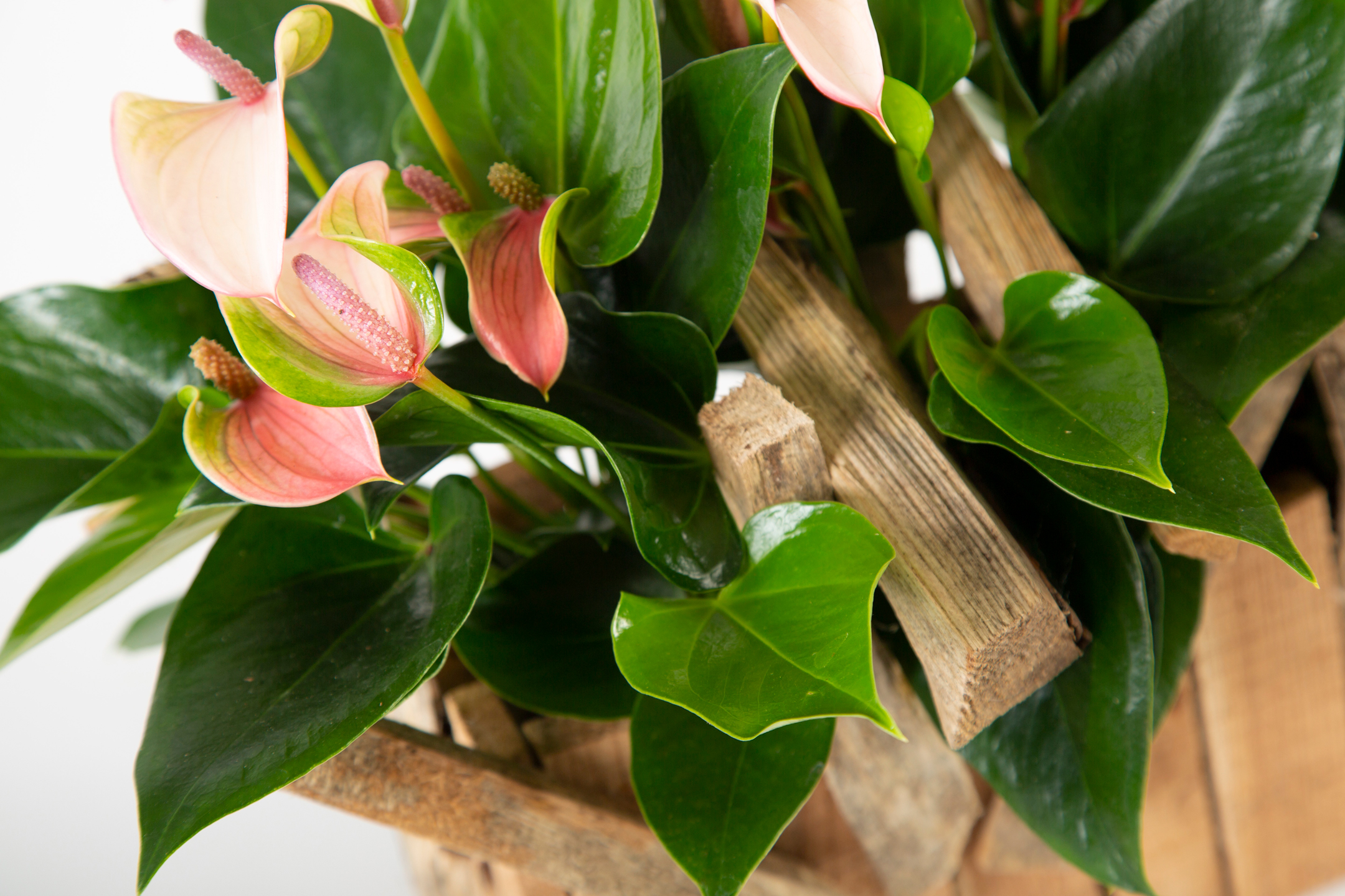 Example of a nice wooden DIY container for a lush Anthurium plant. Design by Pim van den Akker.
