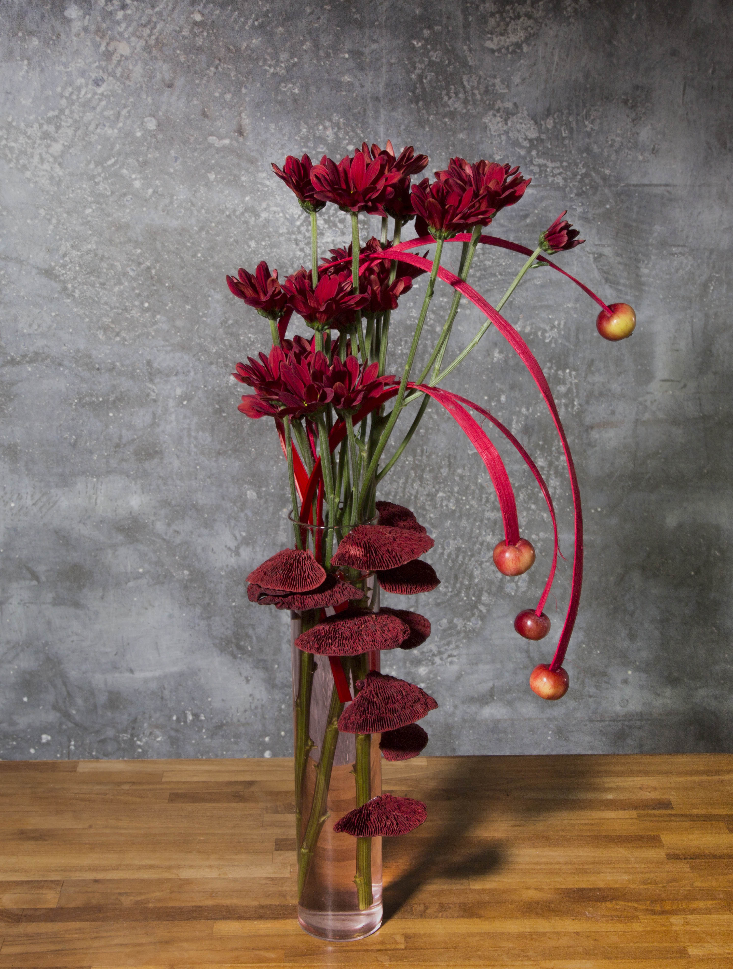 The intense red coloured 'Bontempi' chrysanthemum is such a beauty on its own, that it doesn't need much other than a little dressing up with some 'Malus Domestica' and red coloured dried toadstools.