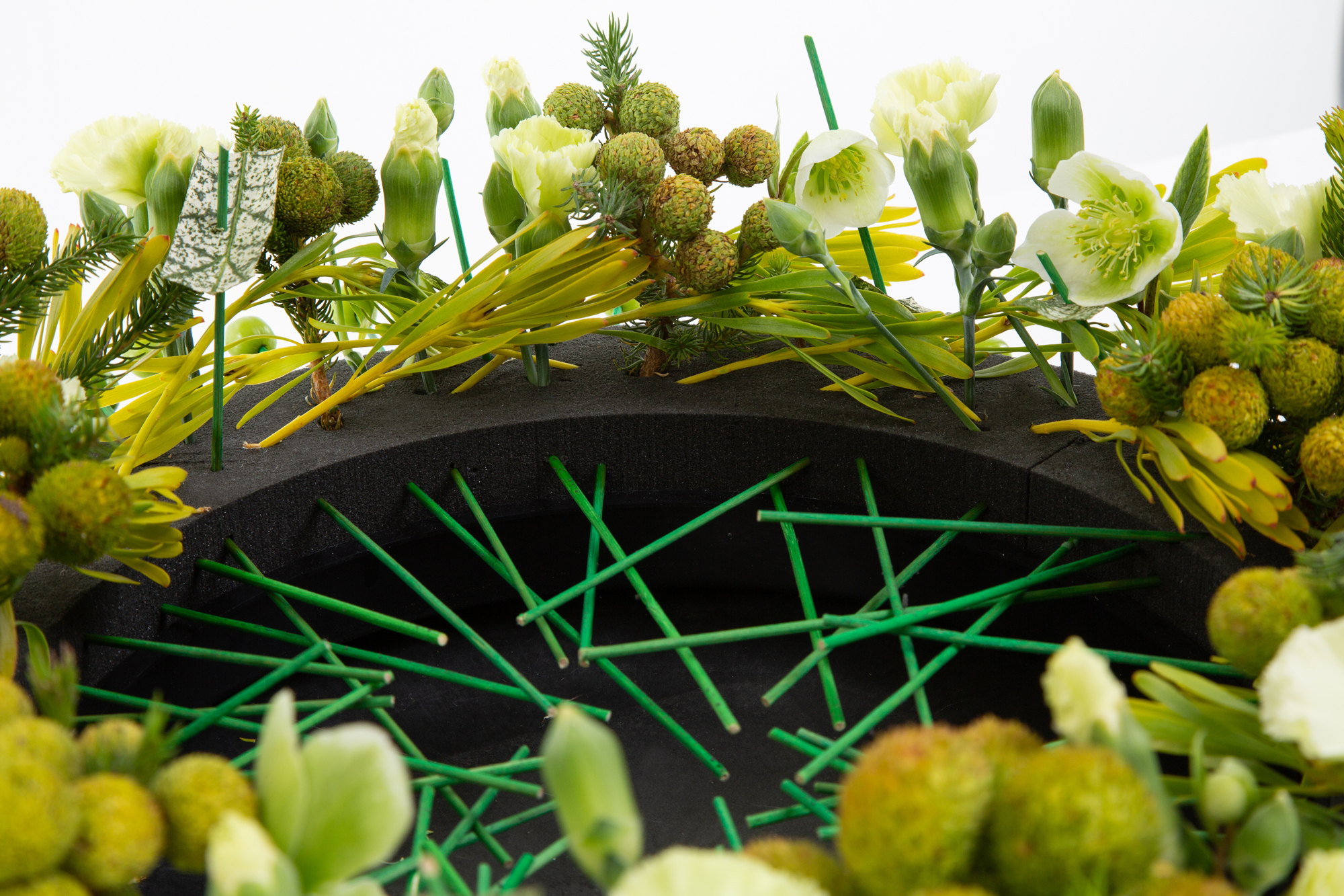 An OASIS® Black Ideal floral foam ring is the base for this subtle green flower wreath by Roos van Unen. As the black foam may be seen, it's is just lightly covered with carnations, Brunia Albiflora and pieces of green wicker on which Hypericum berries have been pierced.