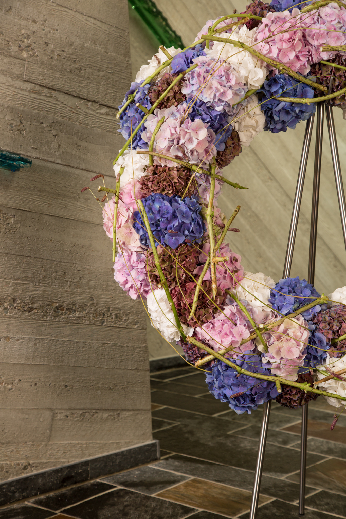 A wreath solely made from wonderful Hydrangea flowers. Roos van Unen created this beautiful funeral wreath using several varieties of fresh cut Hydrangeas and just a touch of Sanguisorba. It actually works quite fast as the cut Hydrangeas has a lot of volume per stem.