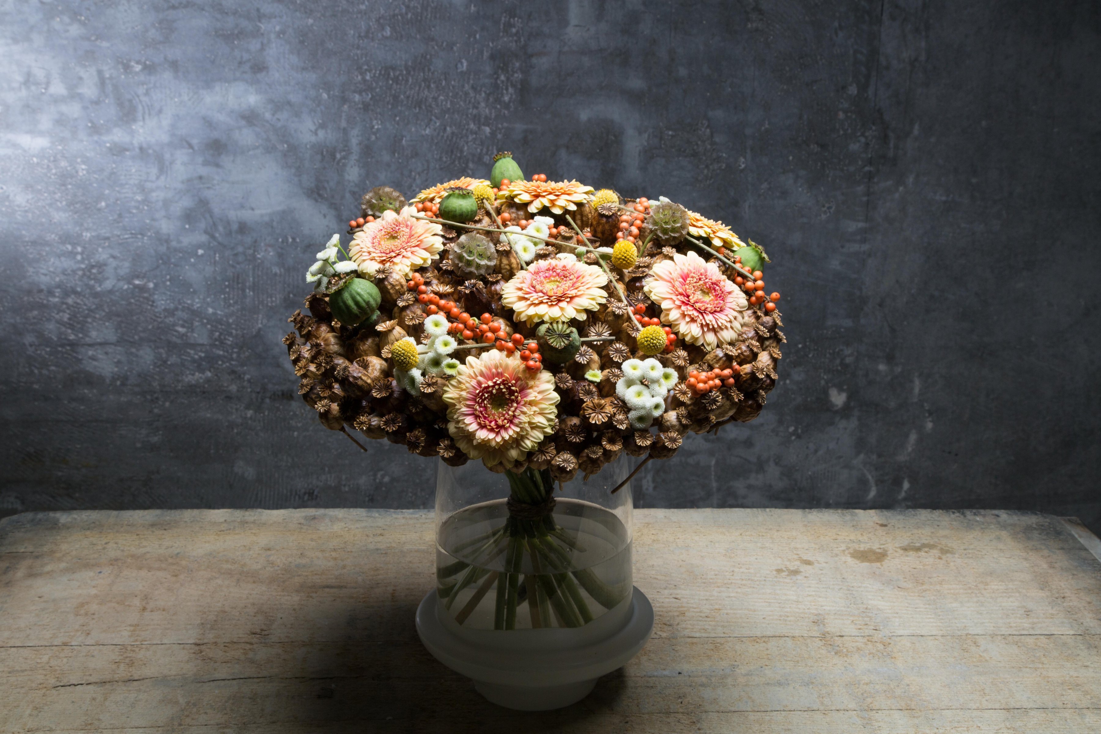Roos van Unen created this unusual bouquet: she glued together dozens of poppy seed boxes with some hot glue. It's quite a task but worthwhile; you can use the frame more than once, using different flowers each time.