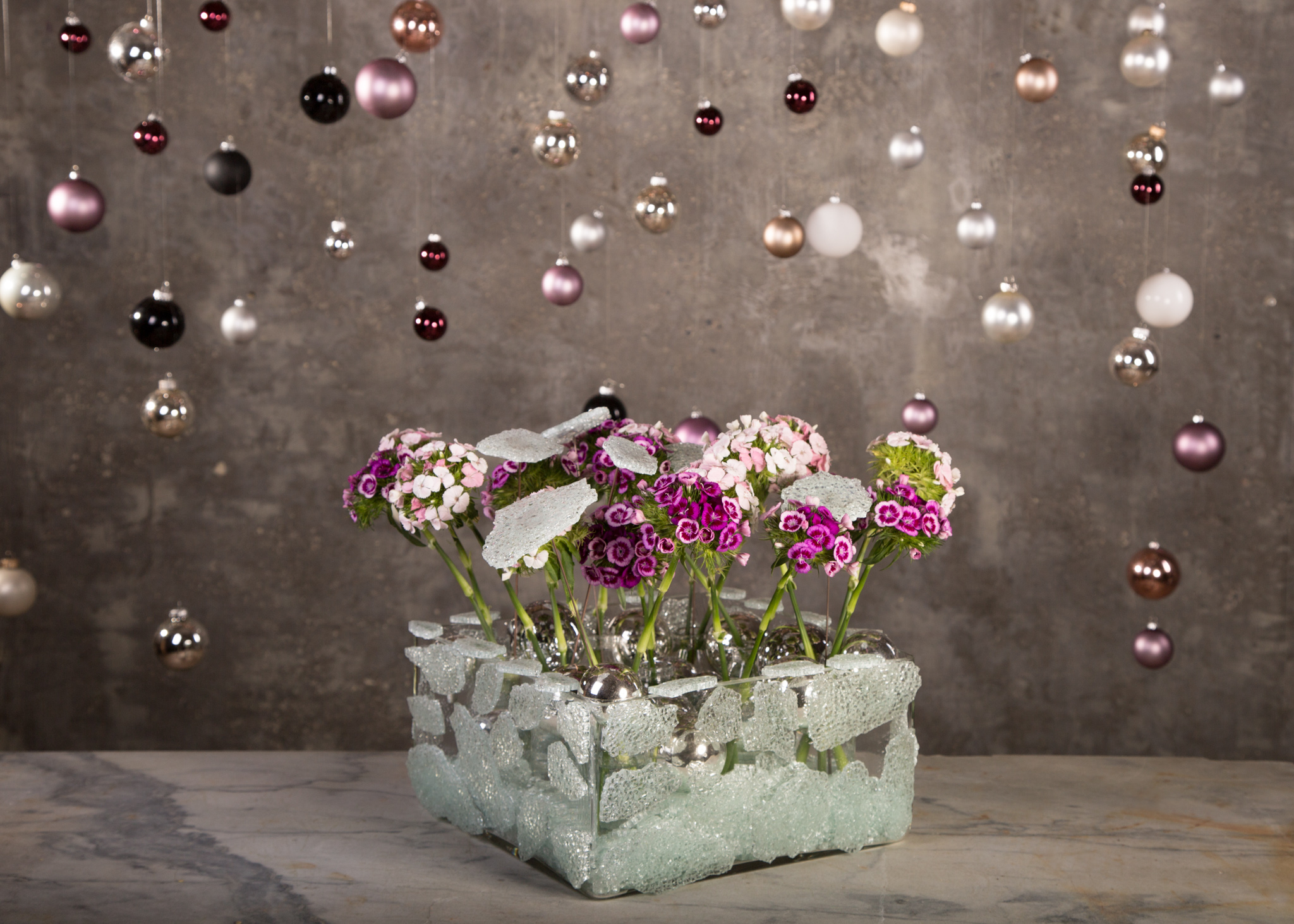 Add a little spark to your Christmas flower arrangements! These big purple and pink Sparkz Breanthus® varieties from HilverdaKooij are called 'Elmo' and 'Earl and these guys are wonderful for an edgy Christmas flower arrangement. In this design, Pim van den Akker takes recycling to the next level; he used broken safety glass as a detail and glued the pieces on the glass bowl and placed in between the flowers. It does have a cool effect, don't you think? Dare to be different!