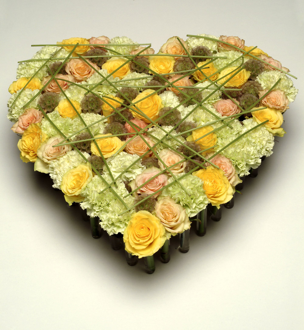 A heart-shaped arrangement made up primarily of carnations and various coloured roses and Scabiosa in soft tones to achieve a charming appearance.