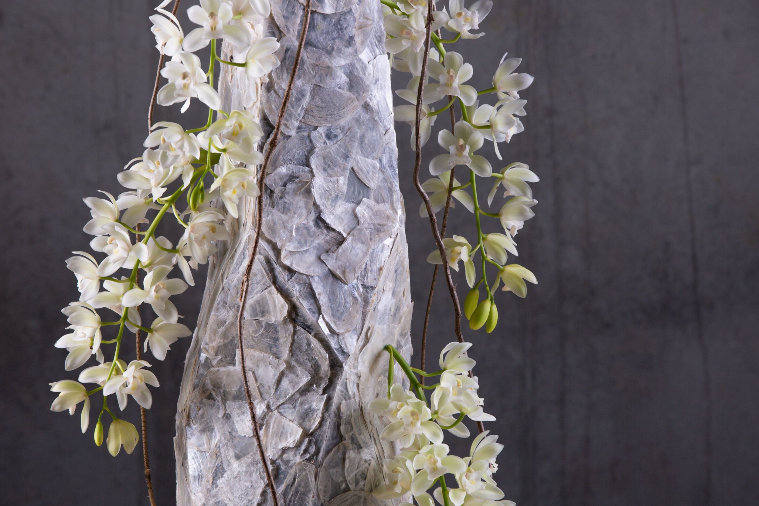 The 'Ice Cascade Cymbidium' is a special plant with lush flowering white jewels. Like other Cymbidium varieties, these flowers can also be used as cut flowers. In this design they are placed in glass test tubes in a base made from oyster shells. This way, the flowers stay beautiful for over two weeks. The aerial roots are from the Monstera.