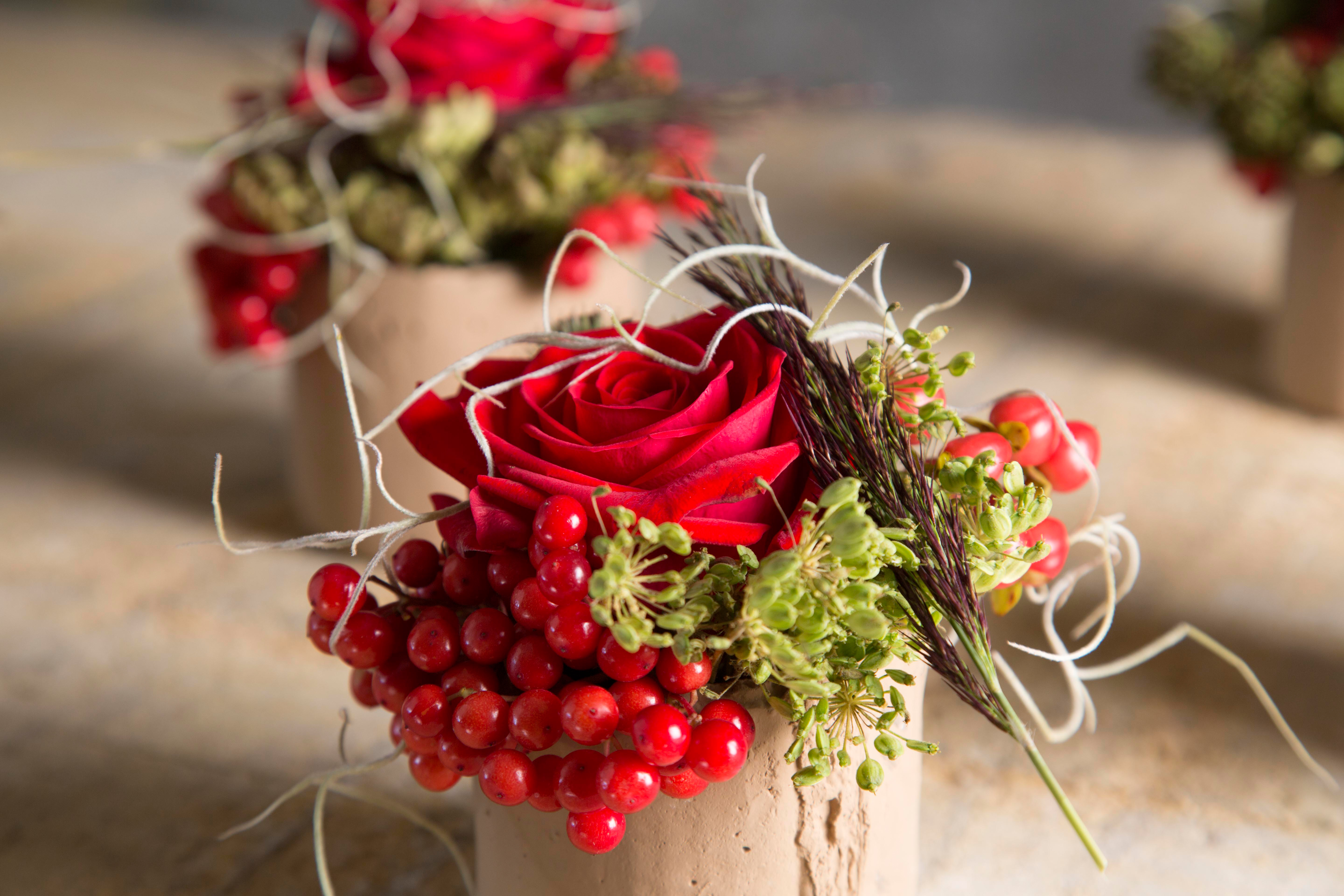 A close up of the sweet little flower compositions by Pim van den Akker with beautiful Red Eagle® roses, perfect to dress that Christmas dinner table!