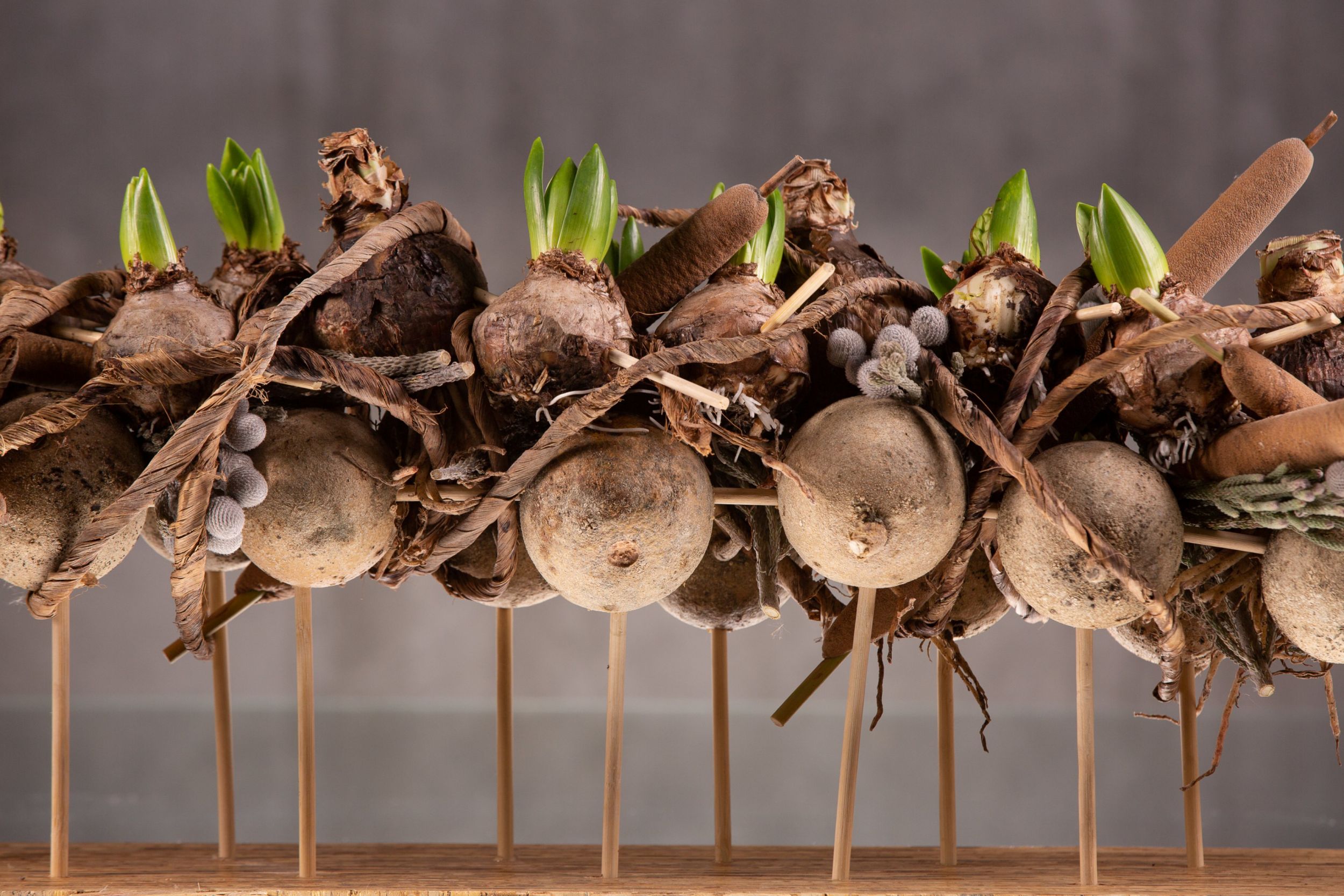 The Hyacinthus bulbs and Amaryllis bulbs give this composition a festive look. Finish it off with dried fruit like wood apples, Thypha and Brunia. That gives this centerpiece a winterly look and feel. The bulbs and materials are all from Bab Star.