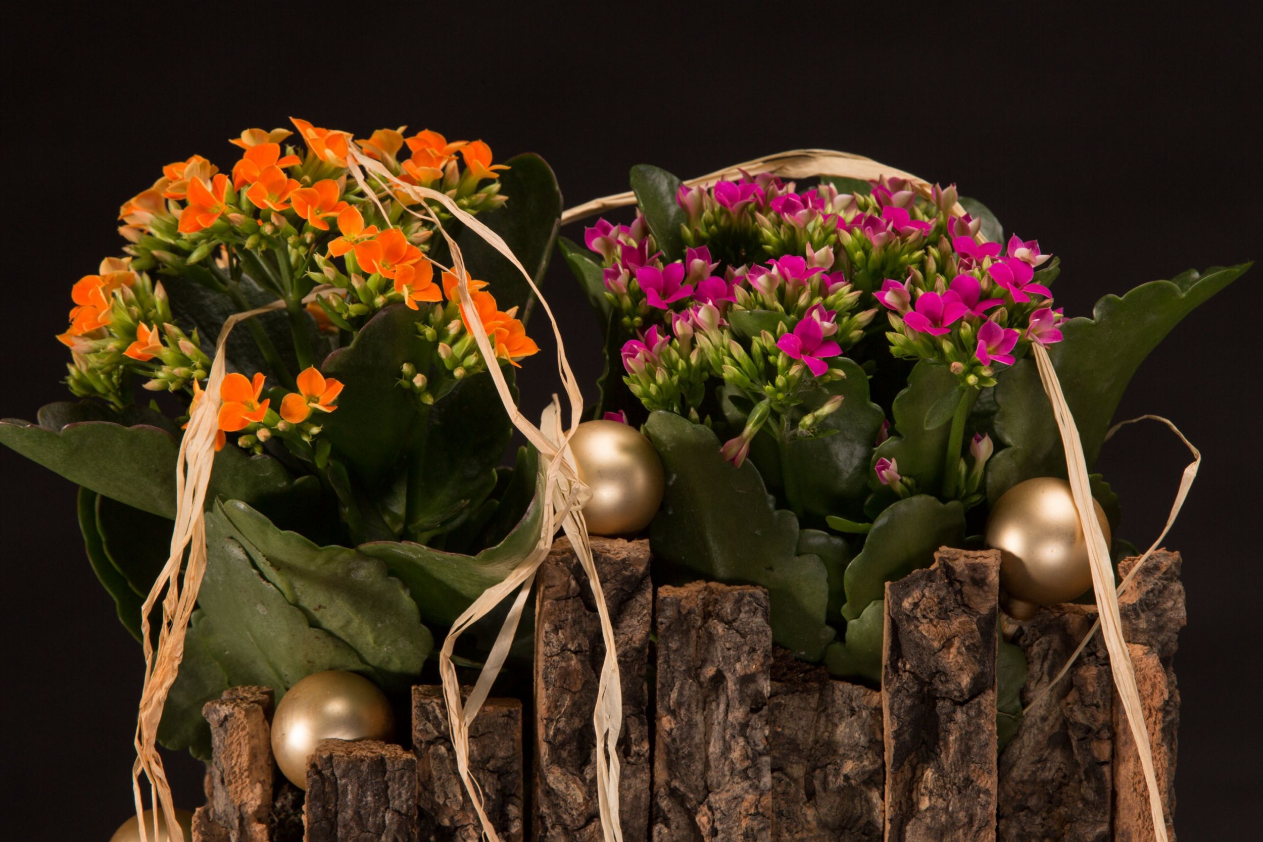 Wintery Christmas design with the flowering succulent Kalanchoë from Always Kalanchoë. Celebrate Christmas with colour! The Kalanchoë is the perfect plant for that: it's a strong plant which you can enjoy long after Christmas. In this design, the Kalanchoë is placed on a pedestal in a separate container decorated with cork bark which creates a natural look. Placing a Christmas bauble here and there, combined with raffia dripped with candle wax, gives the design a festive and subtle Christmas feeling.