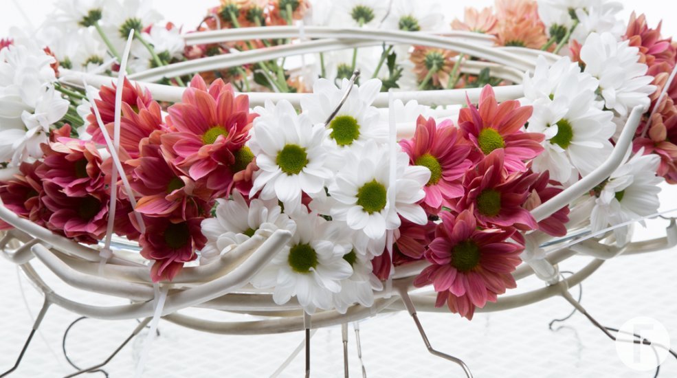 A design derived from the DIY style mood board for Zentoo: Roos van Unen created a shape out of clothes hangers which she tied together with tie-wraps. The hangers hold a glass bowl, filled with the pretty pink Grand Cherry spray Chrysanthemum and white Bouncer Santini. Super original!