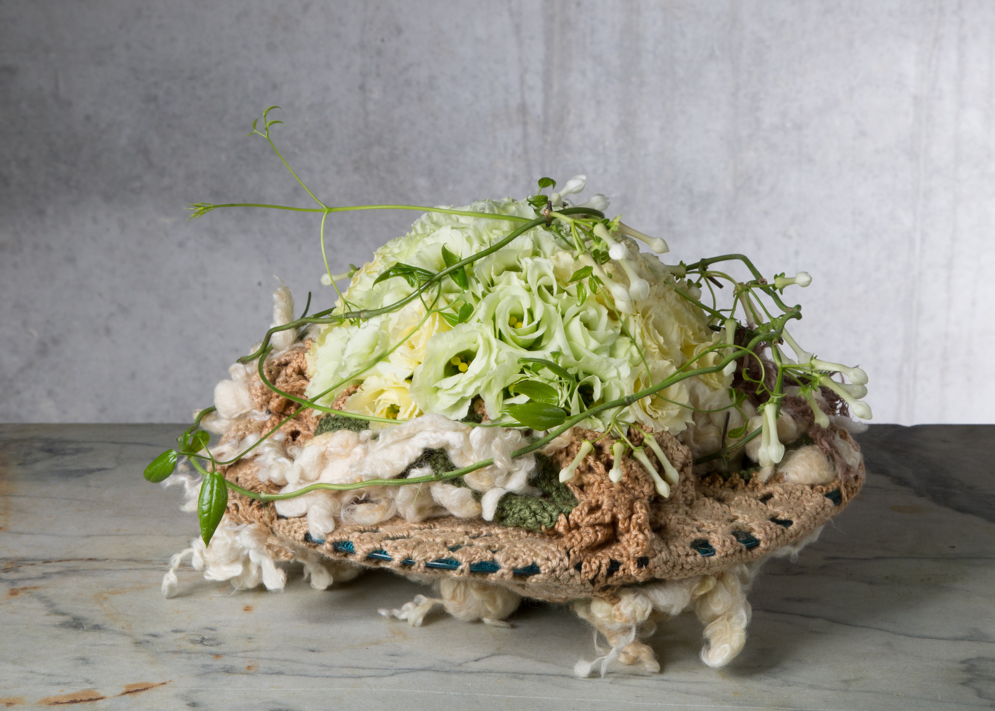The cold whites of these Lisianthus match beautifully with the warm knitted fabric that is wrapped around a simple glass bowl. Nice structures and super easy to make!