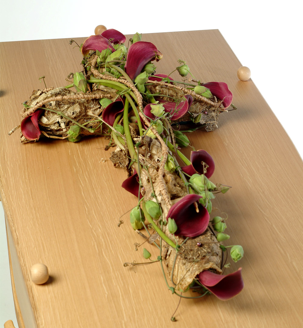 A cross-shaped arrangement with playful vines of passion flowers for a very natural feel, with the whole given a striking accent by the beautiful crimson arum lilies.