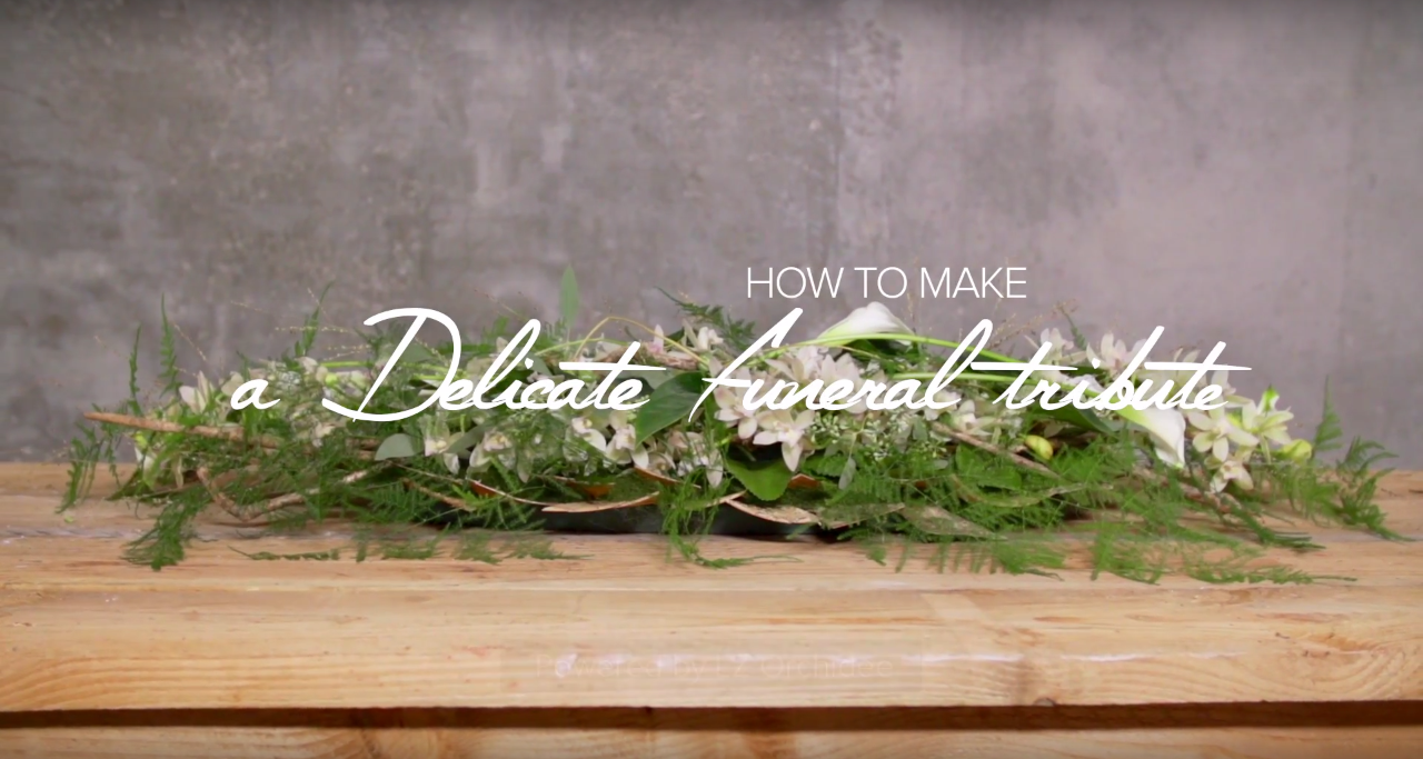 UK based floral designer David Ragg shares a beautiful design idea for a funeral flower arrangement. With flowers such as Cascade Cymbidium and Zantedeschia and different kinds of foliage, David creates a delicate funeral tribute.
